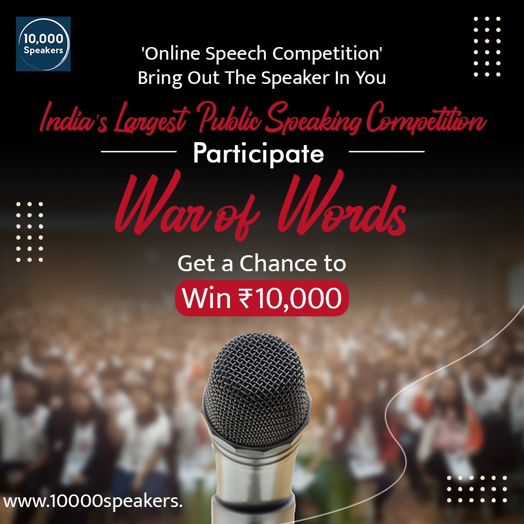 New Delhi, Delhi Jan 5, 2022 (Issuewire.com) - To enhance the communication skills of students and working professionals, also to motivate them to express their views on a public platform '10,000 speakers' is launching an opportunity to participate in the public speaking competition “WAR OF WORDS" (English, Hindi, or Hinglish) through online mode, this debate objective is to provide a platform to the young minds who want their voices to be heard, students and working professionals from all the departments are cordially invited to participate actively in the debate. The competition starts with three thrilling rounds including a video and two live speech rounds. The whole event is judged and managed by professional experts. For the first round, the participants are given a set of topics and are required to create a short creative 2 to 3 minutes video on any of the given topics of their choice and submit it to the website on or before 15th January, the topics are; Is India’s youth responsible for its future? , Importance of friends in life, Is cinema hall culture going to die?