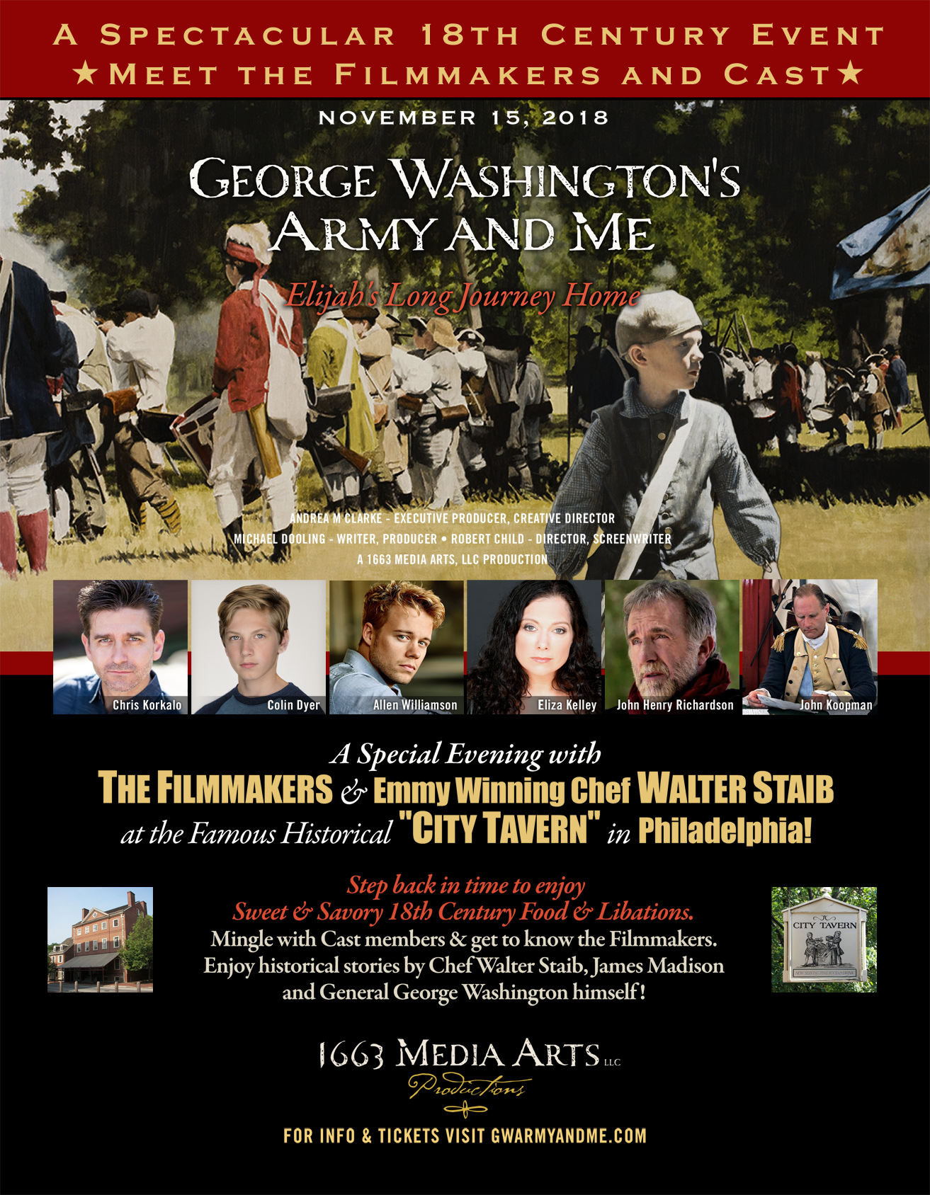 Chef Staib and 1663 Media Arts will host a "Meet the Filmmaker's" Special Evening at City Tavern Restaurant on November 15th this Fall. 18th Century Period Clothing, Food and Drink will add ambience to the evening along with the film's cast in character, crew and Historical Stories by Chef Staib, Lt. Col. Alexander Hamilton and General George Washington himself!