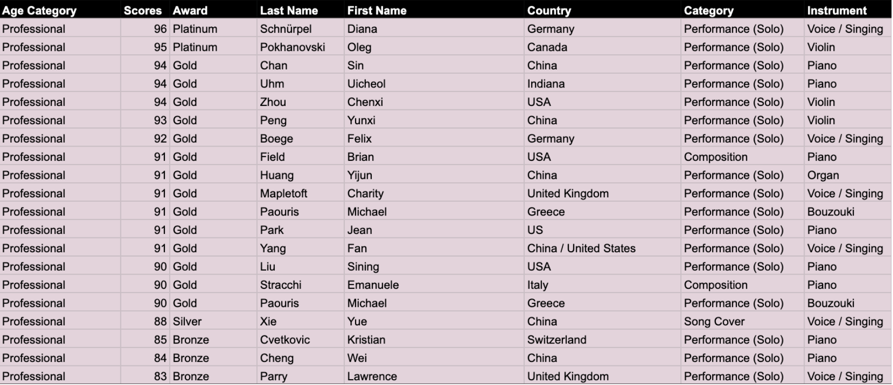 95% Platinum Award - Anthony Lee Collegiate Performance (Solo) Piano - USA