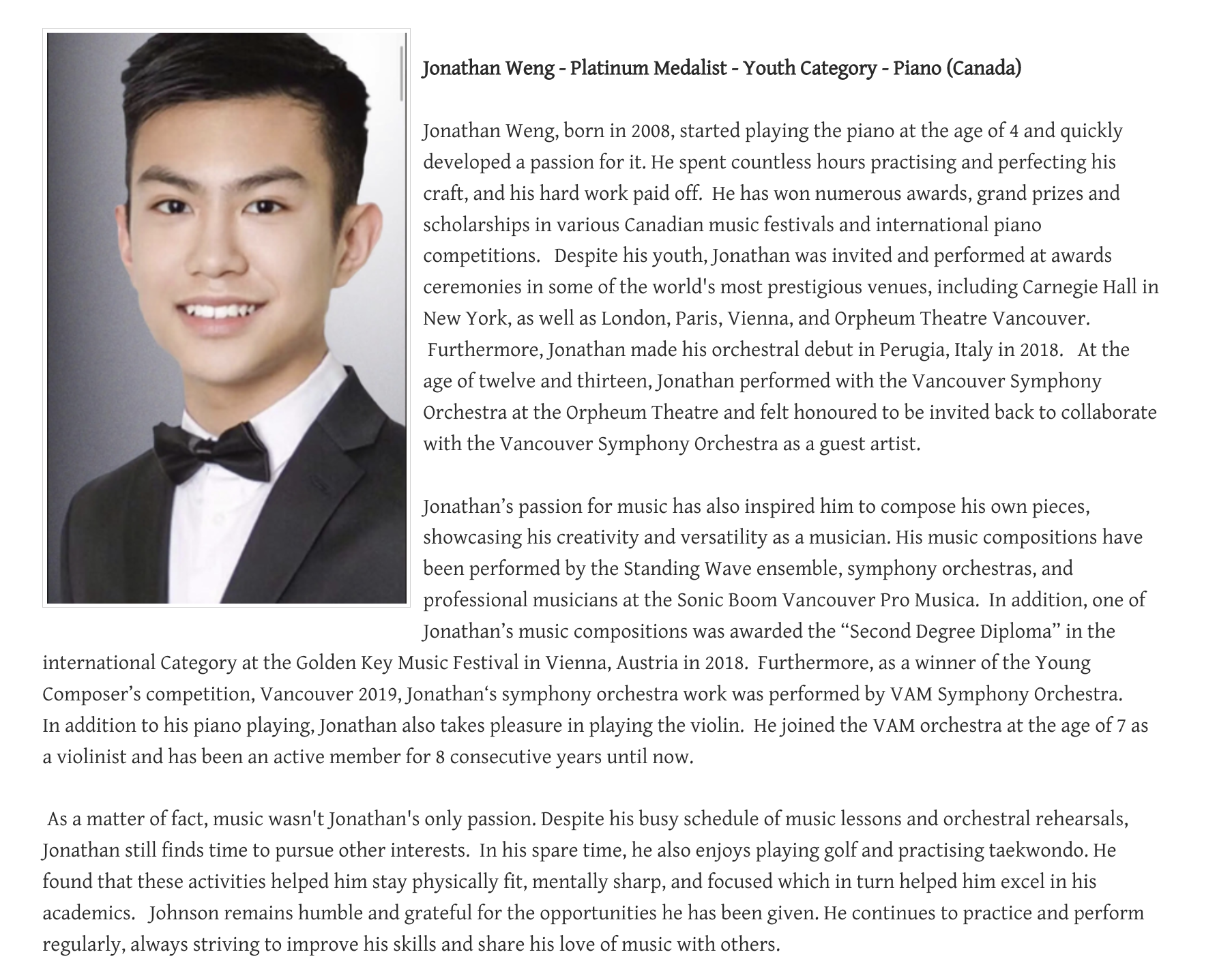 Congratulations to all winners and participants for their outstanding performances and hard work. We hope that this competition serves to inspire our young musicians to continue to strive for excellence and to share their musical voices. We also hope that this online winners' gala concert serves as a motivator and inspiration while nurturing a sense of mutual appreciation amongst finalists.