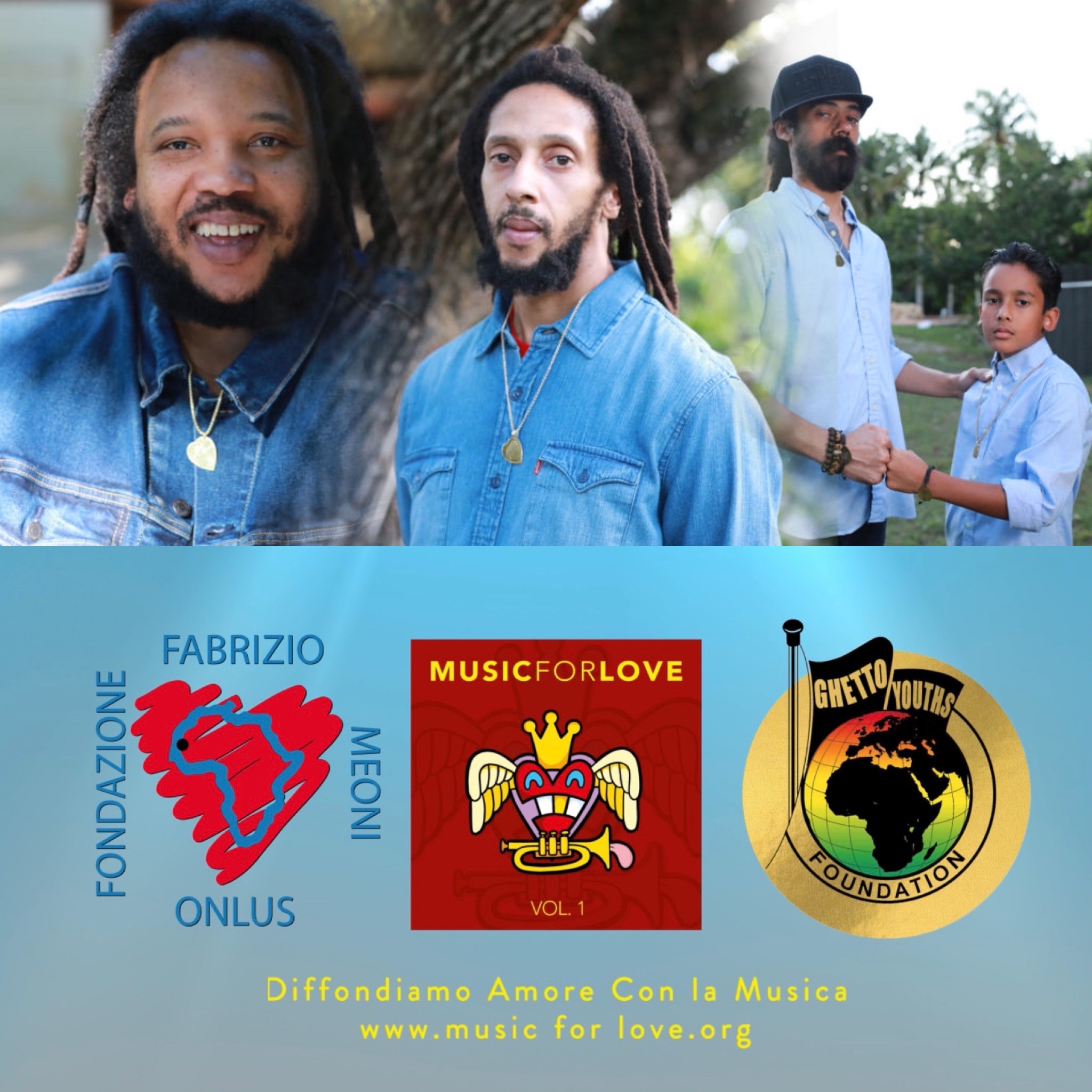 100% of the proceeds from the sale of the album and any concerts/merchandise will be in fact donated to the FABRIZIO MEONI ONLUS FOUNDATION and to the GHETTO YOUTHS FOUNDATION, the charitable organization founded and directed by Stephen, Damian, and Julian Marley, sons of the legend Bob Marley.
