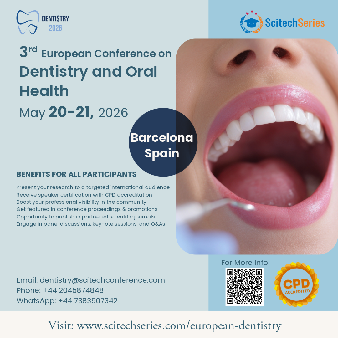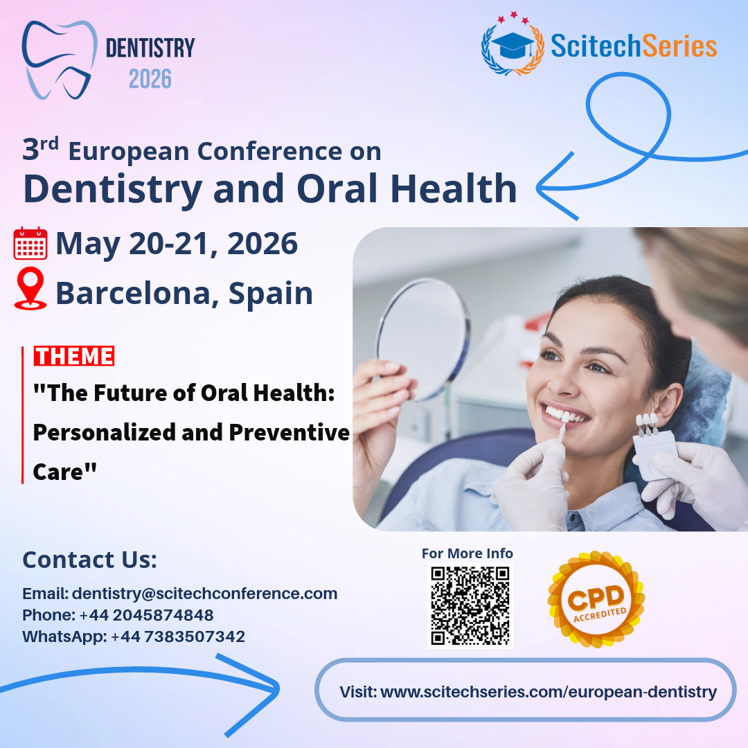 Dentistry 2026 is an annual event that brings together global Dental experts to facilitate the exchange of the latest insights on factors influencing dental diseases and oral healthcare. This international conference, occurring at a critical juncture, will primarily focus on recent notable oral cases. It is tailored to cater to the interests of faculty members, researchers, dentists, scientists, healthcare practitioners, clinicians, oral healthcare specialists, caregivers, industry representatives, and Dental professionals. Also, this conference has distinguished keynote presentations, interactive panel discussions, oral abstract presentations, poster sessions, and a diverse array of scientific and Dental equipment exhibitors, all contributing to a comprehensive program. The Congress is committed to upholding its reputation for excellence by delivering timely exploration of cutting-edge topics in the realm of emerging Dentistry.