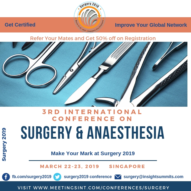 Singapore, Singapore Feb 18, 2019 (Issuewire.com) - Surgery 2019 is a live occasion made out of workshops, lunch & learn. It will provide unique learning and career building opportunities that you just can’t find anywhere else. Surgery is the innovation comprises of physical meditation on muscles and tissue. The surgery is considered when it includes in cutting a patients tissue or conclusion of beforehand maintained injury. Surgery is classified as criticalness, level of intrusiveness and sort of strategy, kind of obtrusive system and unique instrumentation. In surgery, Anaesthesia assumes a fundamental part. The 3rd international conference on Surgery and Anaesthesia will be held from March 22-23, 2019 at Singapore. So we invite you to join the global event that impacts the advancements and technology trends in Surgery and Anaesthesia. This Surgery 2019 is focused to address the constant effort being made by scientists and scholars to improve the existing and inventing novel technologies for the future. So let’s be a part of Surgery 2019 in Singapore!!