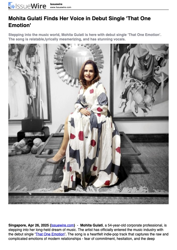 Mohita Gulati, a 54-year-old corporate professional, is stepping into her long-held dream of music. The artist has officially entered the music industry with the debut single ‘That One Emotion’. The song is a heartfelt indie-pop track that captures the raw and complicated emotions of modern relationships - fear of commitment, hesitation, and the deep yearning for something real and lasting. Written, sung, and co-composed by the artist herself, the song feels intimate and relatable and blends thoughtful lyrics with a smooth, melodic production. Every component of the debut track stands out, further proving Mohita's artistry and talent.