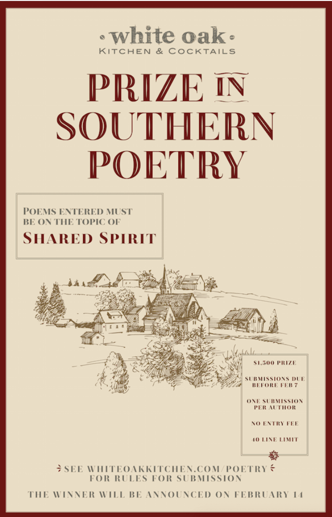 For 2020, poets from across the South are invited to participate in the fifth annual White Oak Kitchen & Cocktails Prize in Southern Poetry. Poems will be on the topic of “Shared Spirit.” All poems must be submitted via email to info@whiteoakkitchen.com no later than Friday, February 7, 2020.