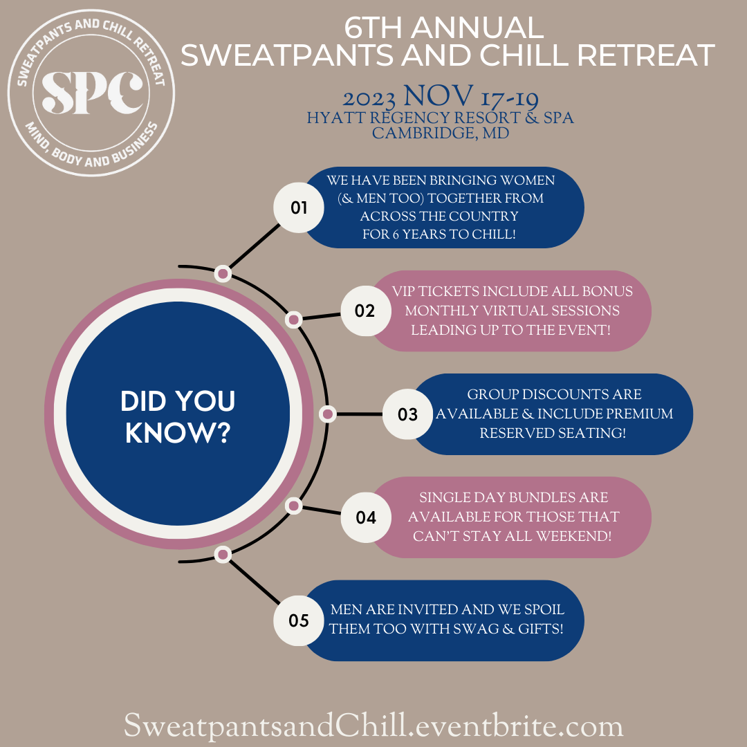 Early bird registration for the 6th Annual Sweatpants and Chill Retreat: Relax/Redo is currently open until September 1, 2023. Secure your spot now to be a part of this transformative event that brings comfort, connection, and true community to the forefront of the conference experience.