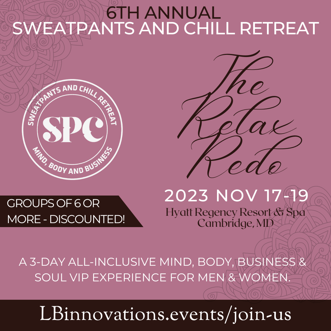 LB Innovations is thrilled to unveil the much-anticipated 6th Annual Sweatpants and Chill Retreat: The Relax Redo, set to take place from November 17th to 19th, 2023, at the picturesque Hyatt Regency Chesapeake Bay Golf Resort, Spa, and Marina. This unique event, born from the desire to break free from conventional conference norms, is a harmonious blend of retreat and conference, inviting participants to embrace relaxation, personal and professional growth, and meaningful connections.