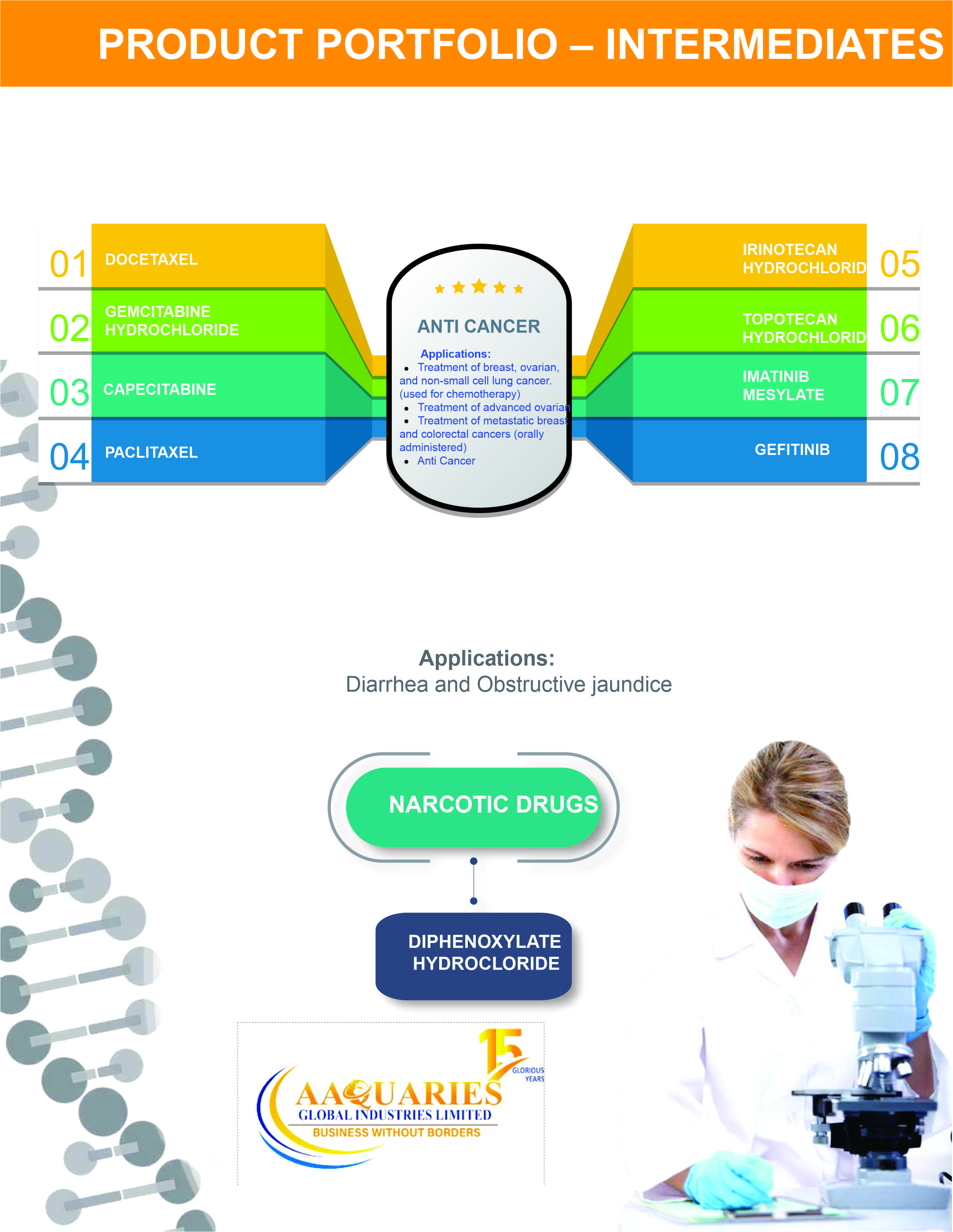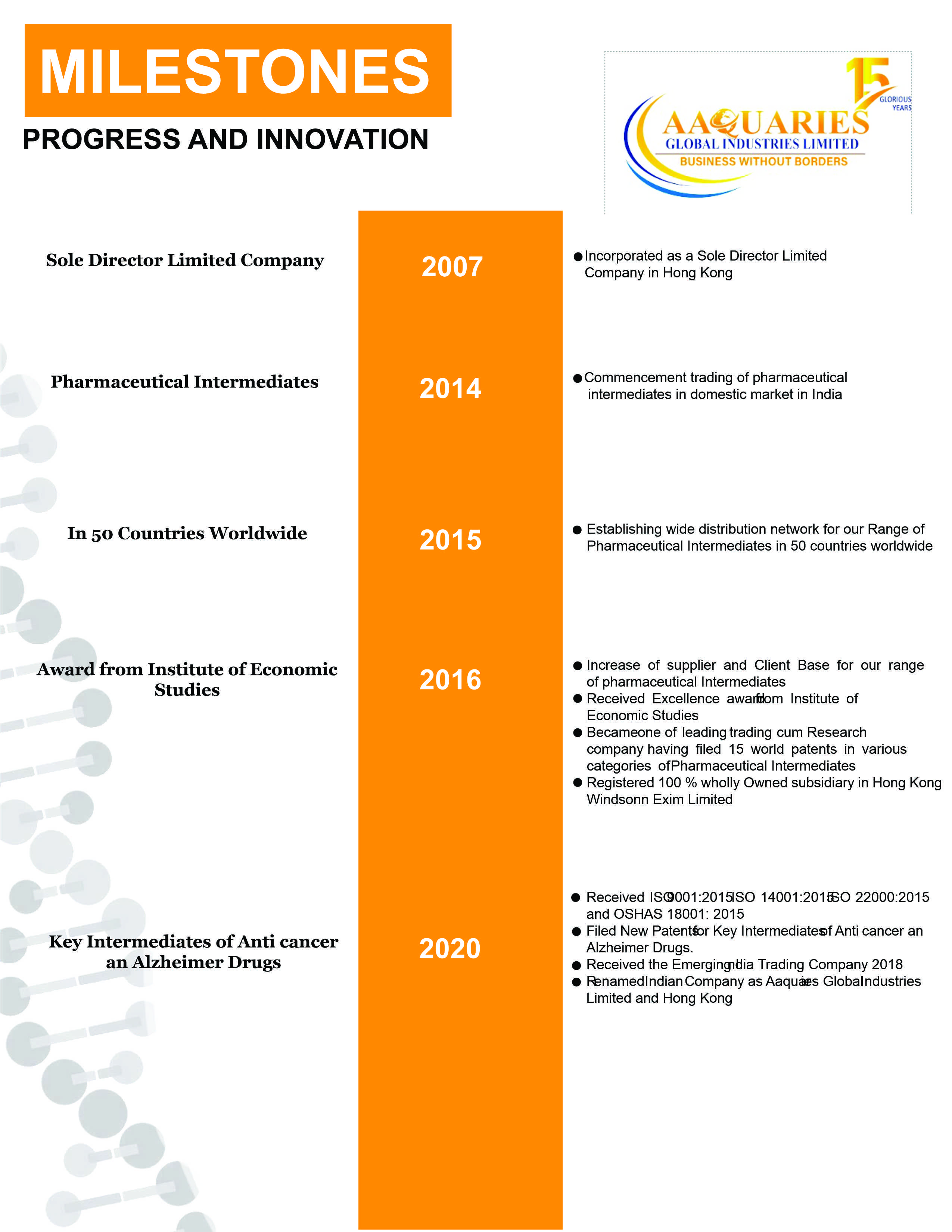Aaquaries Global Industries Limited, headquartered in Mumbai India is one of the fastest-growing pharmaceutical companies focusing on the development, manufacturing, and sale of high-quality and affordable process R&D and API manufacturing service providers for the worldwide pharmaceutical industry since 2007. Aaquaries Global Industries Limited has uniquely integrated development, regulatory, and manufacturing capabilities & has offices in Dubai, Singapore, and Hong Kong. Aaquaries Global Industries Limited offers a wide portfolio of services ranging from APIs for the generic industry to custom synthesis for early-phase pharmaceutical research and branded products. Aaquaries Global Industries Limited is a customer-focused backward-integrated world-class developer, manufacturer & trader of Active Pharmaceutical Ingredients (APIs). It is the independent company of choice in collaboration with leading producers of advanced API solutions with state of manufacturing facilities with stringent operating procedures and compliance to current Good Manufacturing Practices (cGMP) and applicable regulatory requirements and reliable supply to gain a sustainable competitive advantage. Aaquaries Global Industries has a wide basket of a portfolio that includes over 300 APIs across multiple therapeutic segments with a marketing presence in over 75 countries in the Middle East, European and African countries.