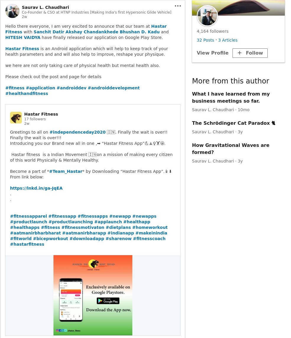 The team of Hastar Fitness showed their excitement by sharing the application over their Social media handles. One of their team member Saurav L. Chaudhari who is also Co-Founder @ CSO at HTNP Industries Pvt. Ltd. shared the post on LinkedIn.