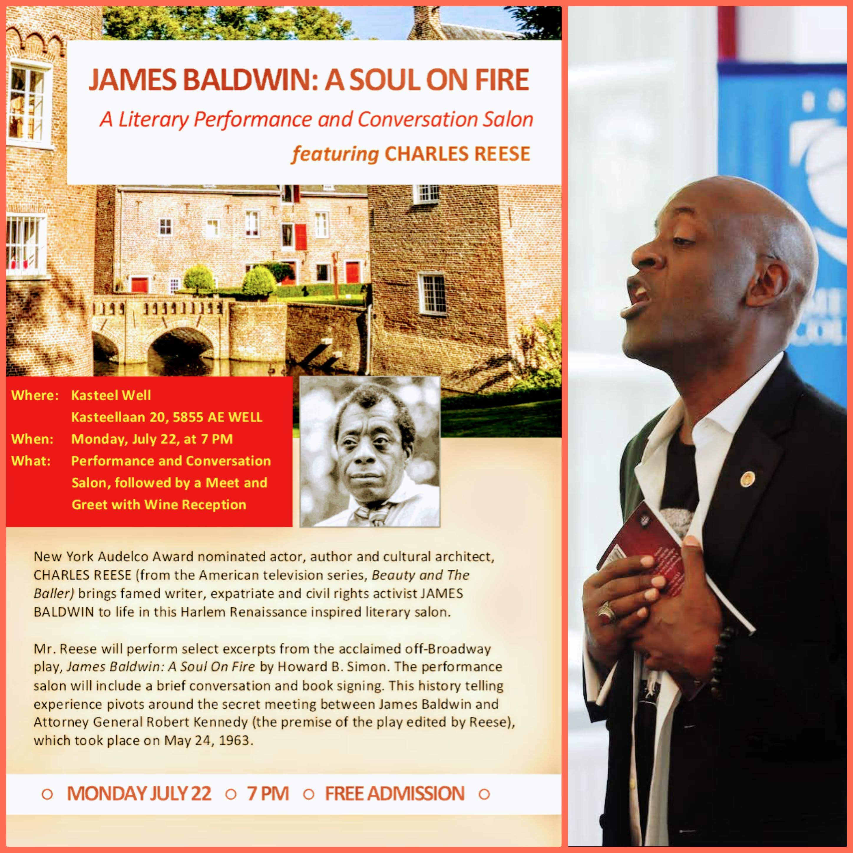 An Evening in History with James Baldwin featuring Charles Reese will take place on Monday, July 22, 2019, at 7 pm, Kasteel Well. Kasteellaan 20, 5855 AE WELL. Book signing, meet and greet coupled with a wine reception immediately follows. The event is Free and Open to the Public. RSVP: dulcia_meijers@emerson.edu.