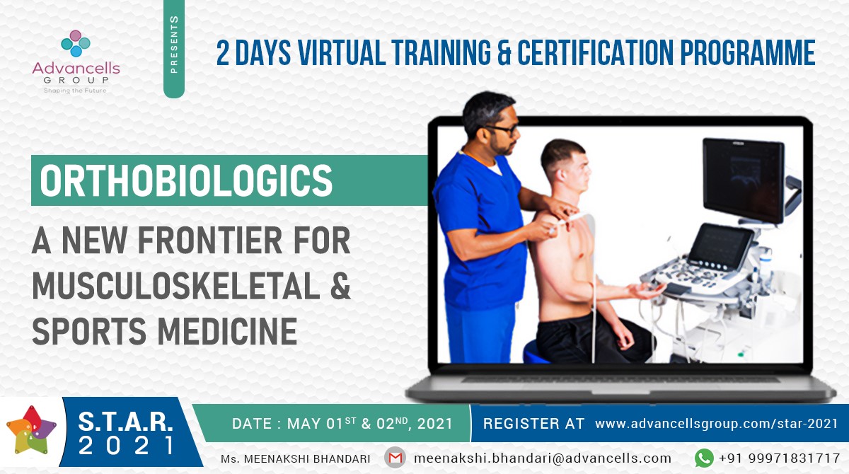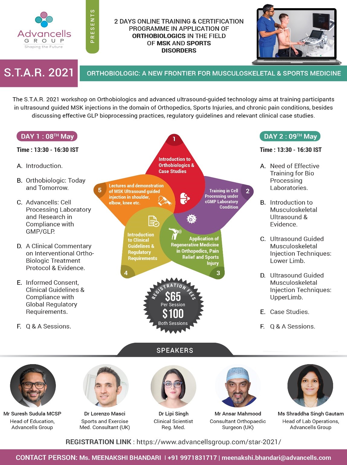 S.T.A.R 2021 (Orthobiologics-A New Frontier for Musculoskeletal and Sports Medicine | Date: 8th and 9th May) by Advancells Group brings a unique opportunity for orthopedic doctors, surgeons, PMR doctors, sports and pain medicine experts to learn high-end ultrasound-guided musculoskeletal injection techniques, GLP/GMP compliant bioprocessing technology, and relevant clinical regulations. The international speaker panel of the virtual workshop includes Mr. Suresh Sudula MCSP [Head of Education, Advancells Group and Director of The Kent Musculoskeletal Clinic (UK)], Dr. Lorenzo Masci [Sports and Exercise Medicine Physician (UK)], Dr. Lipi Singh (Clinical Scientist Regenerative Medicine), Mr. Ansar Mahmood [Consultant Orthopedic Surgeon (UK)], and Ms. Shraddha Singh Gautam [Head of Lab, Advancells Group].