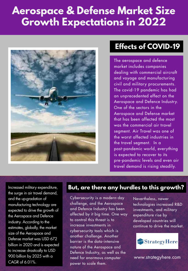 The aerospace and defence market includes companies dealing with commercial aircraft and voyage and manufacturing civil and military procurements. The COVID-19 pandemic has had an unprecedented effect on the Aerospace and Defence Industry. Although there has been some recovery since then, it is uneven and unpredictable. One of the sectors in the Aerospace and Defense market sectors that were severely affected was the commercial air travel segment. The pandemic locked people away from the world into their houses and put a stop to all kinds of travel that people regularly ventured in. Air Travel was one of the worst affected industries in the travel segment. It reduced the demand for aircrafts thereby reducing air traffic. Huge losses followed. The Defence sector wasn't much affected by the pandemic since countries did not reduce their military expenditure. Due to disruptions in the supply chain, the costs escalated and there were time delays. All of these things are expected to recover to pre-pandemic levels in the post-pandemic world, as the demand for air travel is increasing steadily. Increased military expenditure, the surge in air travel demand, and the up-gradation of manufacturing technology to produce more cost-efficient machines are expected to drive the growth of the Aerospace and Defence industry.