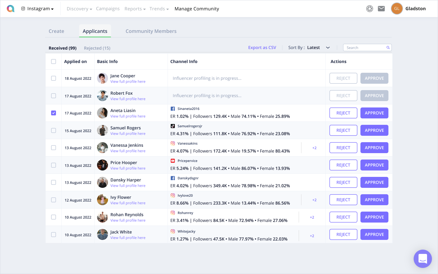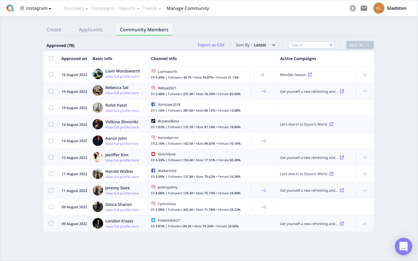 The community feature does it all for you. It automates the management of these content creators, gives you a consolidated picture of their social media statistics, and enables you to decide whether the applicant is a good fit for your next campaign. The potential grows even higher as the community helps you connect with others who can be your prospective customers at various points in their purchasing cycles.