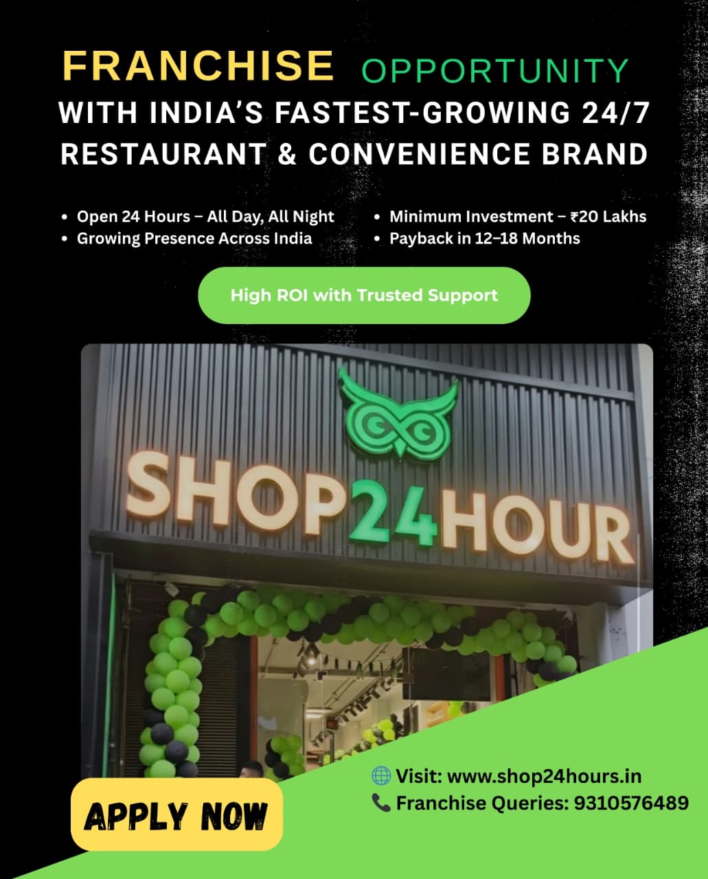 Shop24hour is revolutionizing convenience retail with its innovative 24x7 live kitchen and café concept, offering freshly prepared food along with everyday essentials. Each store, spread across 700–1000 sq ft, provides an engaging social hub for modern urban consumers. The brand’s FOCO franchise model enables entrepreneurs to invest from ₹25 lakhs, with a projected ROI in 18–24 months, backed by strong operational support, supply chain systems, and advanced technology integration.