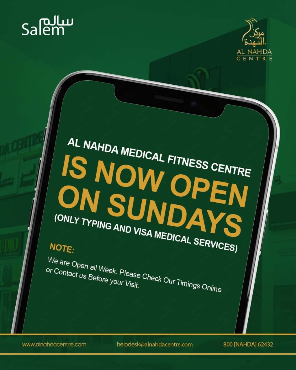 These hours make Al Nahda one of the most accessible service centres in Dubai for visa, medical, and documentation services — open every day of the week for the convenience of residents and visitors alike.