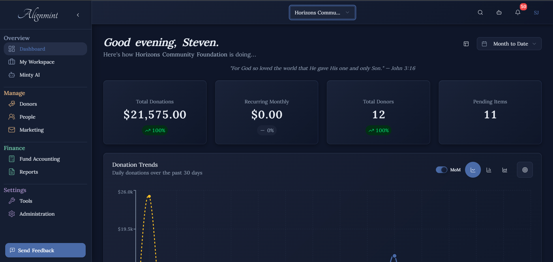 Nashville, Tennessee Feb 13, 2026 (Issuewire.com) - Alignmint, a new nonprofit technology company, today announced the launch of its all-in-one nonprofit management platform at getalignmint.org. The software combines true fund accounting, donor CRM, volunteer management, event ticketing, email marketing, and AI-powered tools into a single, modern interface — and is free for nonprofits with up to $100,000 in annual donations.