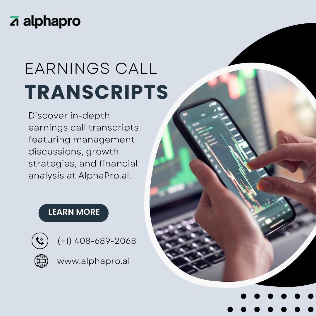 Cupertino, California Mar 30, 2025 (Issuewire.com) - AlphaPro.ai is proud to announce the release of its advanced platform, offering investors unheard of get right of entry to income name transcripts, transcript earnings call data, and in-intensity earnings call analysis gear. To empower buyers, analysts, and monetary fans, AlphaPro.ai simplifies the method of gaining essential insights from company economic reports and discussions.