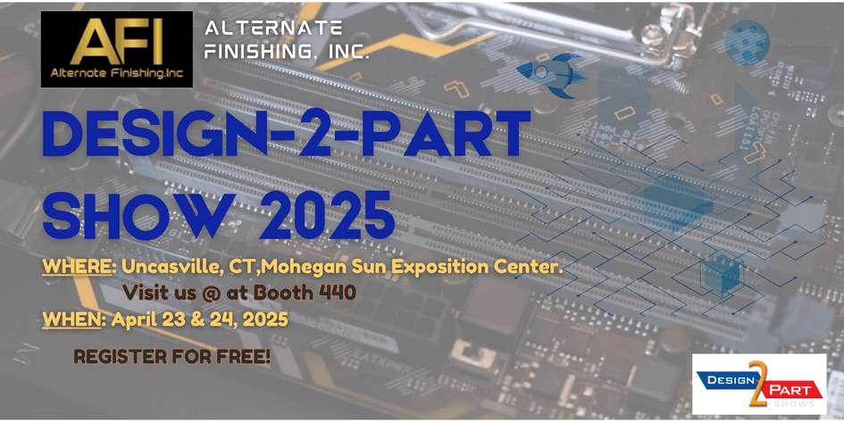 Hudson, Massachusetts Apr 29, 2025 (Issuewire.com) - Alternate Finishing, Inc. (AFI), a leading provider of metal finishing services, including electroless nickel and immersion gold (ENIG), today announced its participation in the 2025 Southern New England Design-2-Part Show. The event will take place on April 23 & 24, 2025, at the Mohegan Sun Exposition Center in Uncasville, CT.
