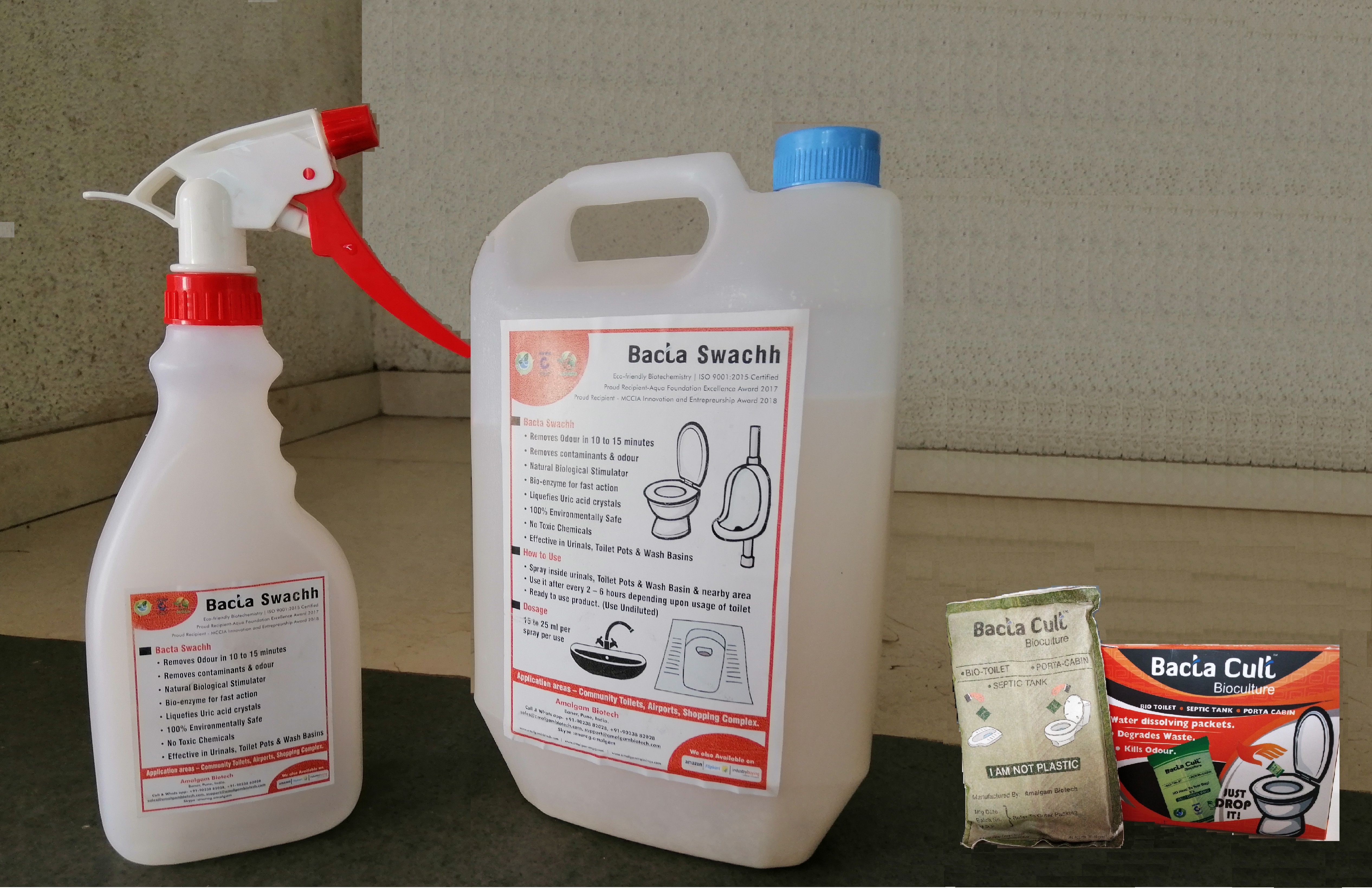 Amalgam Biotech manufactures Bacteria/microorganism based Bioculture for sanitation & wastewater Industry. Bacta Cult BSP comes in 50 gm satchet of water-soluble paper & filled with billions of sewage sludge eating bacteria. The entire satchet is simply dropped inside the toilet pot & it instantly dissolves in the water thereby releasing billions of bacteria into the Toilet/Biotoilet/Septic tank. The bacteria then “eat away” the human waste making the toilet odour free. This usage also eliminates the use of sewage vacuum suction tanker & pipeline cleaning. The urinals were provided with Bacta Swachh –Spray based liquid bacteria culture which makes the urinal block free of bad odours.
