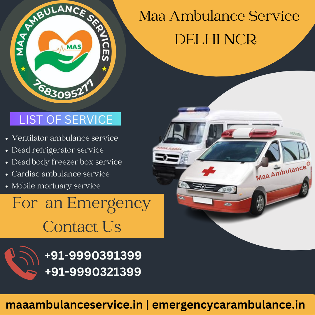 Delhi, India Mar 31, 2023 (Issuewire.com) - The Maa ambulance service is a medical transportation Ambulance service that provides emergency medical assistance and transport to people who are in need of urgent medical attention. It dead body refrigerator service in delhi ncr, Ventilator ambulance service delhi ncr, and Cardiac ambulance service delhi ncr typically involves a team of trained medical professionals, including paramedics and emergency medical technicians (EMTs), who are equipped with specialized medical equipment and transport vehicles, such as ambulances, to provide on-site medical treatment and transport patients to medical facilities.