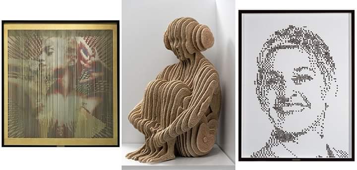 July 4, 2020, along with other works by Mateo Blanco, including Hopi Girl, made from rope; Ellen, a portrait of Ellen DeGeneres made from coffee beans; and Desire, a series of Madonna portraits which change when viewed from different angles, can be purchased through the Rosenbaum Contemporary gallery in Boca Raton, Florida.
