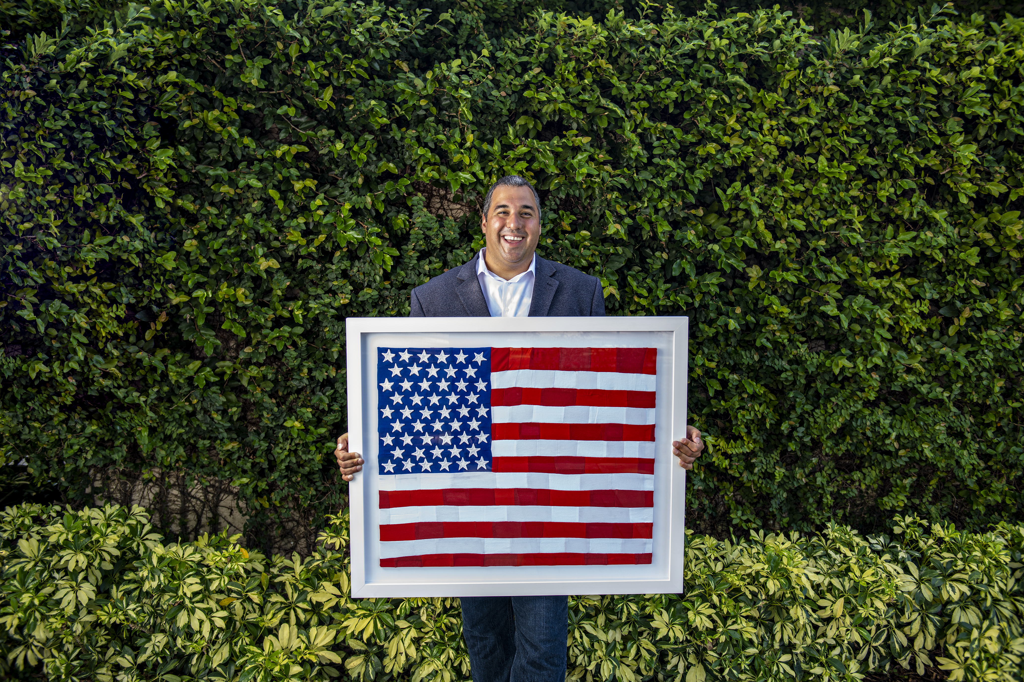 Blanco created July 4, 2020, a portrayal of the American flag made from his clothing. Each of the iconic colors making up the flag not only has meaning to this country but to Blanco personally. The white fabric was made from a shirt he often wore while studying at Florida Atlantic University as he worked hard to not only gain knowledge but wisdom. The red stripes are created from his lucky interview shirt, something he typically wore while spreading his art and message with others. The blue swatch was from the favorite blue workout shirt he wore when trying to get healthy. All fabrics and colors used in the piece represent Blanco putting his best foot forward, which is exactly what he’s encouraging all other Americans to do.