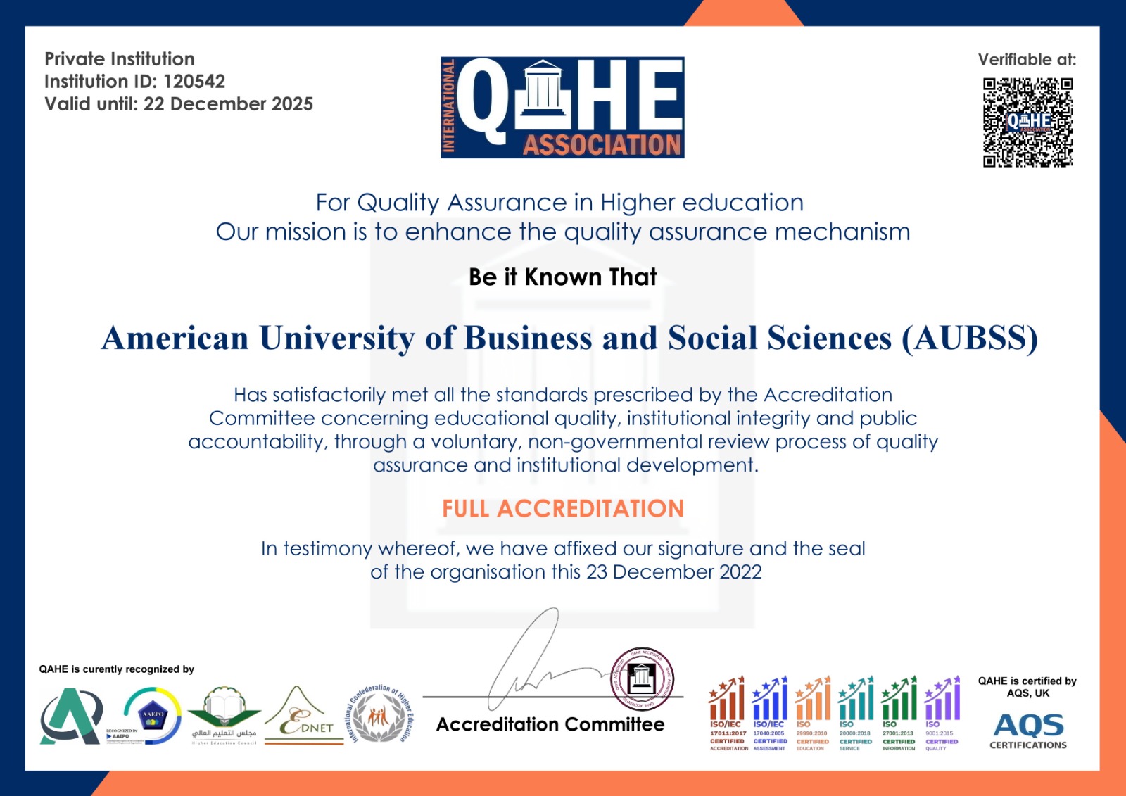 The American University of Business and Social Sciences (AUBSS) is a distinguished institution providing high-quality education in the fields of business and social sciences. AUBSS holds accreditation from The Public Foundation "Independent Accreditation Agency "BILIM-STANDARD" of Kyrgyz Republic and the International Association for Quality Assurance in Pre-tertiary and Higher Education (QAHE). The university offers a comprehensive range of academic programs, including online BBA, online MBA, online DBA, and online PhD, delivered by distinguished faculty members.