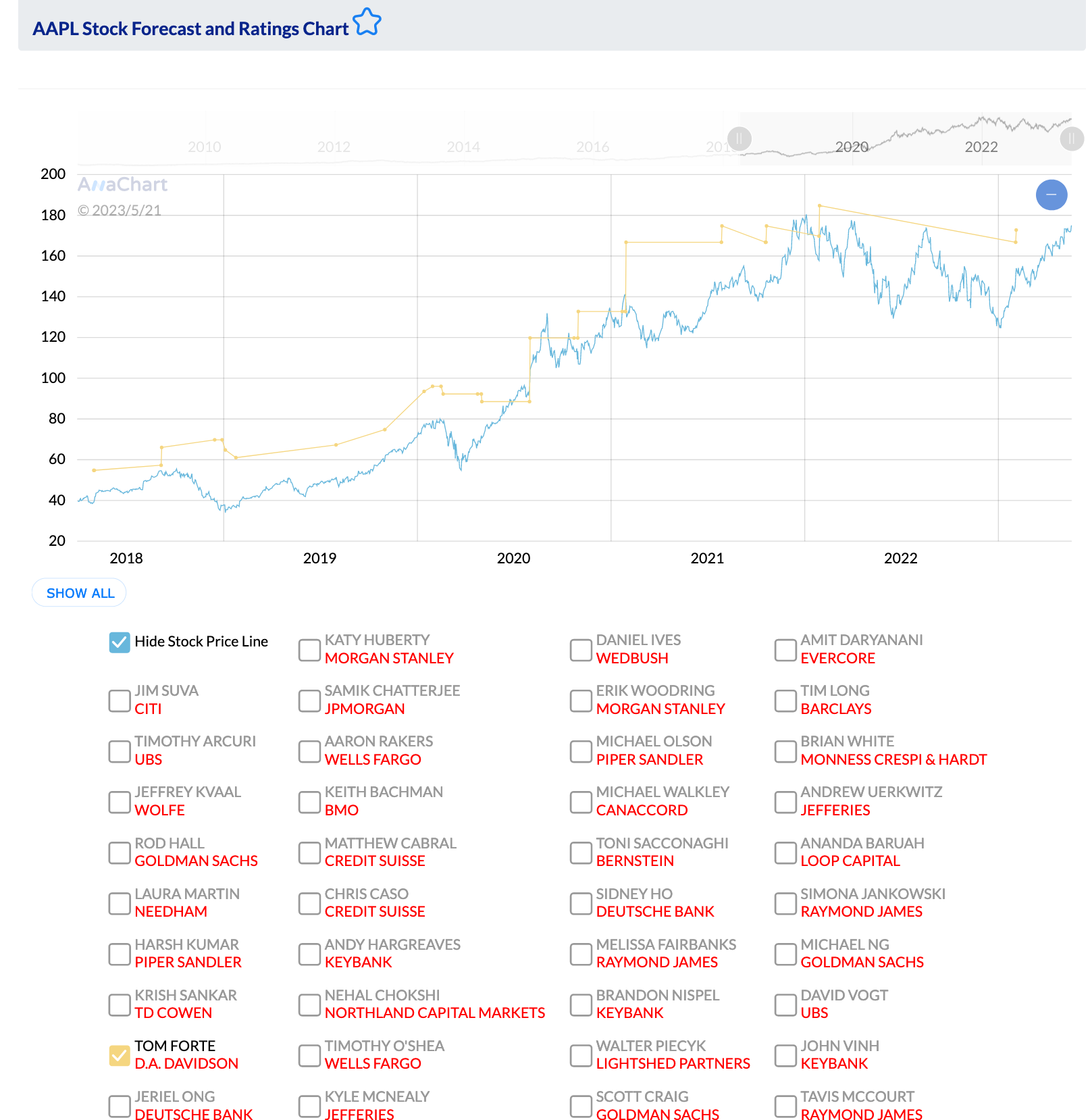 The results are quite visible as AnaChart displays the analyst's previous stock price targets, as you can see in the snapshot below the D.A. Davidson analyst has consistently performed well with his stock forecasts before the Apple stock price moved. "Tom Forte had 21 out 22 of his price targets met on the Apple stock within less than six months on average with an average upside of 31% on his stock forecasts%.
