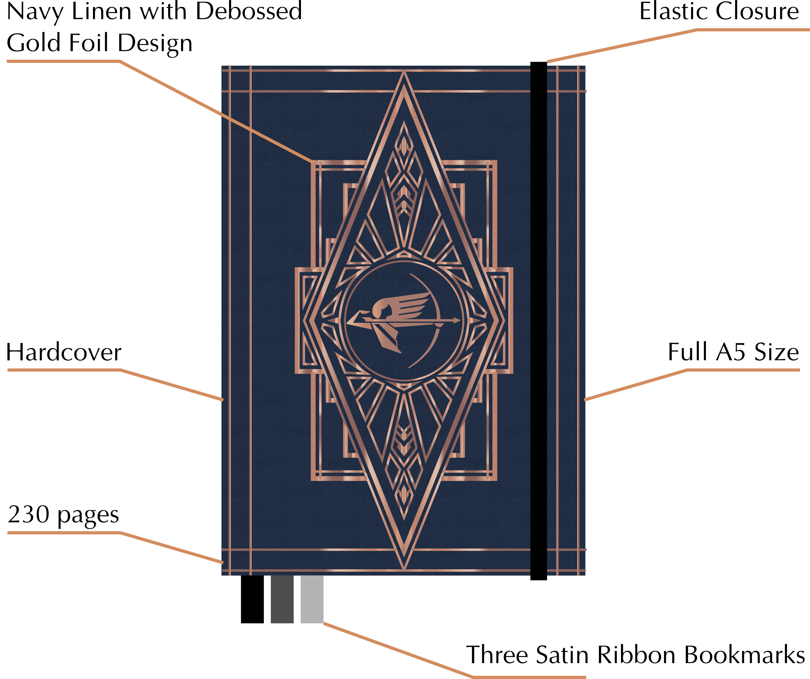 5.8” x 8.3” • Hardcover with Gold Foil Design • Elastic Closure Band • Three Ribbon Bookmarks • 232 Pages • One Year Undated