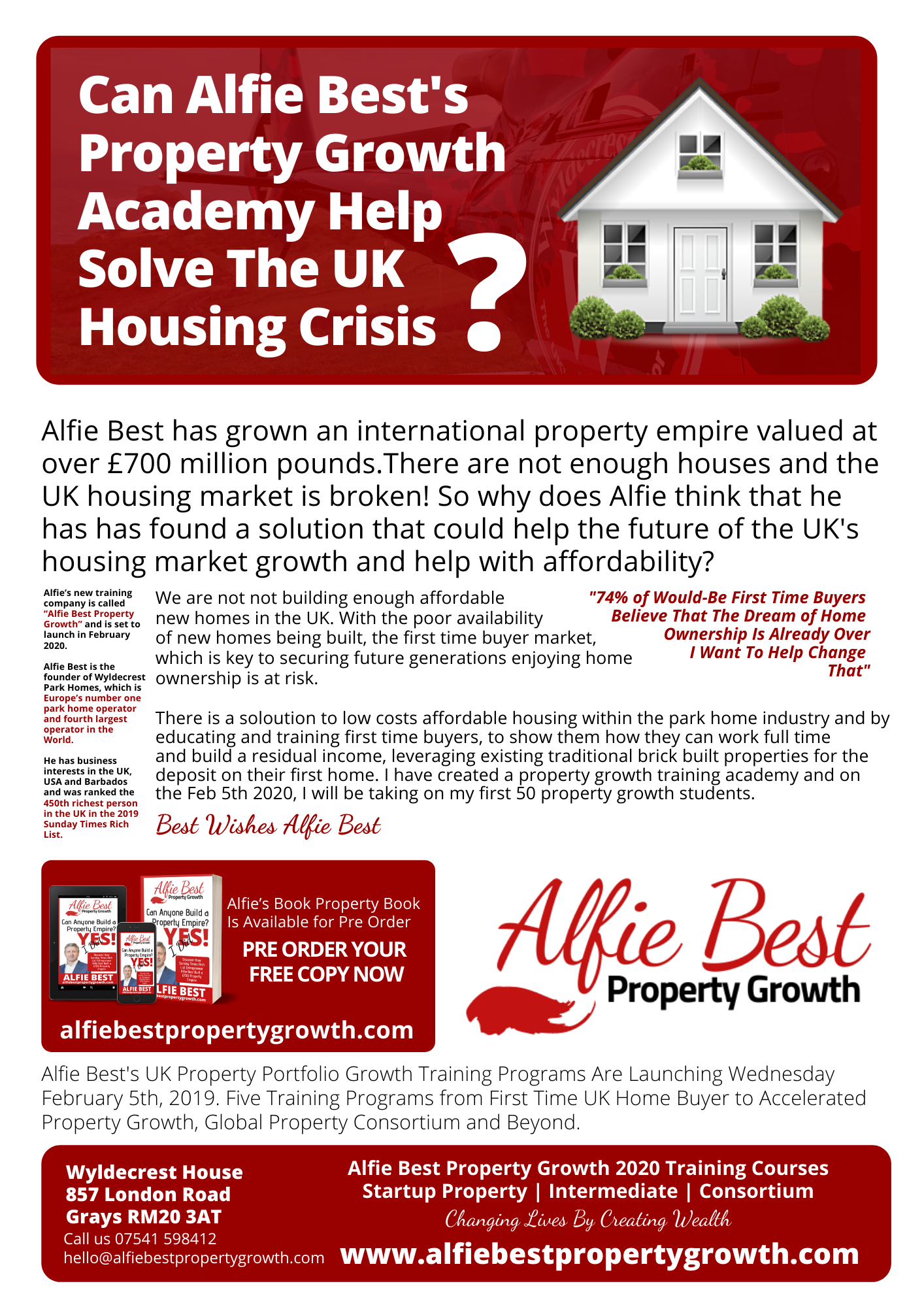Sunday Times Rich List Multi-Millionaire Alfie Best founder of Wyldecrest Parks launches a complete property training academy that takes his delegates from first-time buyer property home ownership through to growing and developing their property assets wealth.