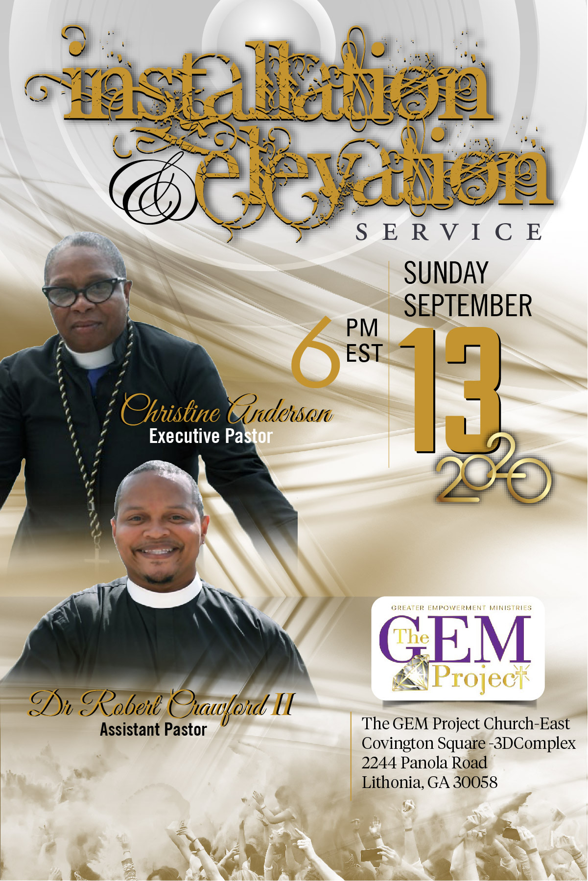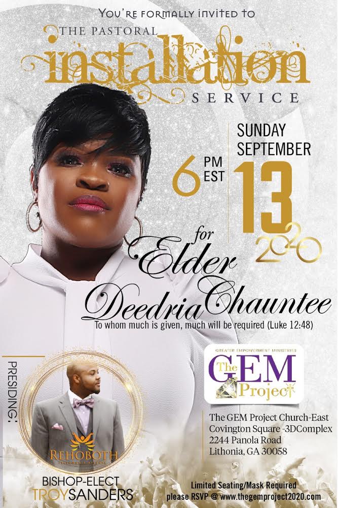 On Sunday, September 13, 2020, @ 6 pm, the GEM Project Church will celebrate 365 days of successful ministry with our Official Pastoral Installation and Elevation Service. Bishop-Elect Troy Sanders of Rehoboth Fellowship Of Atlanta will officiate the service. Pastor Designate Deedria Chauntee will be installed as the Lead Pastor. Pastor Christine Anderson who serves as the executive pastor and Pastor Dr. Robert Crawford II who serves as the assistant pastor will also be installed at said time.