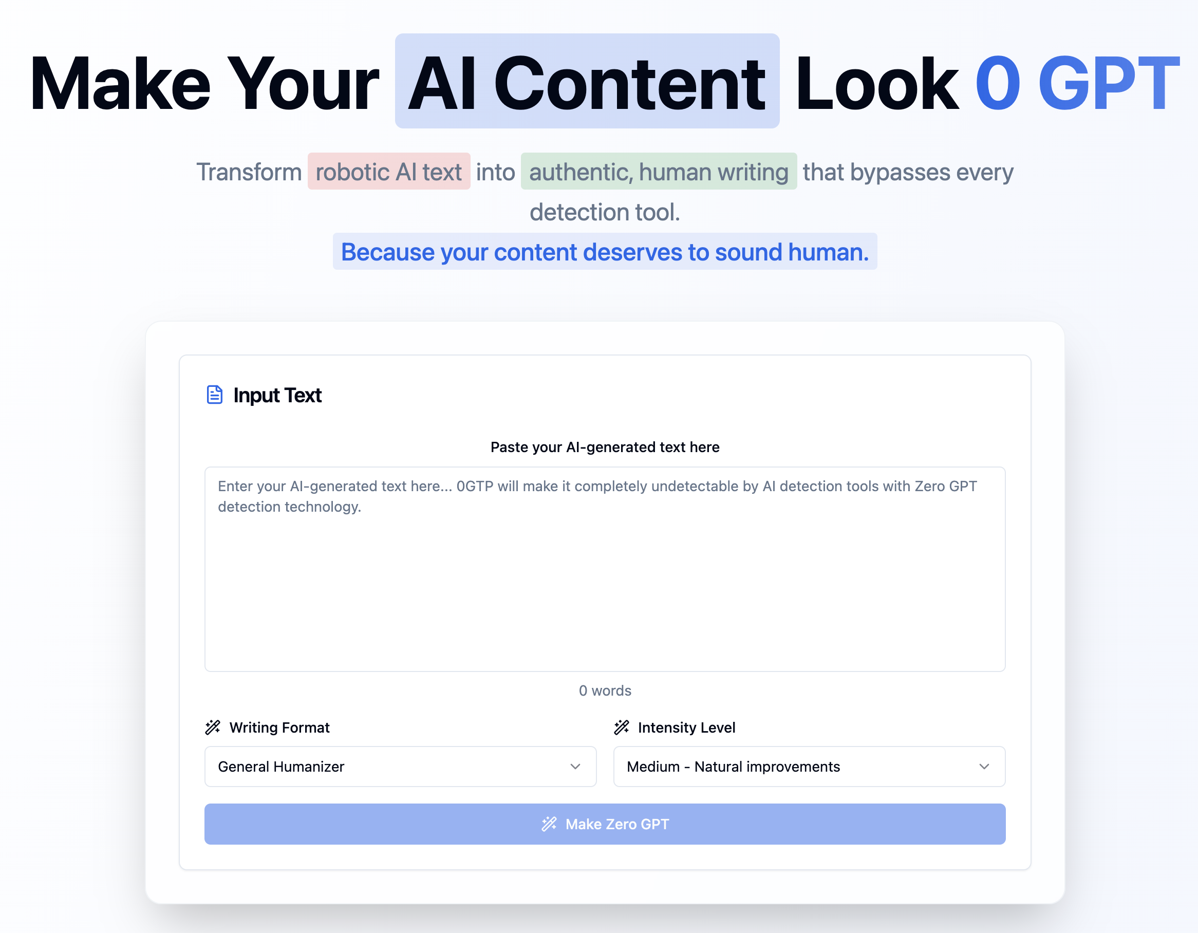 0GPT is designed for content creators, students, professionals, and businesses who rely on AI tools but want their writing to remain natural, engaging, and undetectable by popular AI detection systems such as GPTZero, Turnitin, and more.