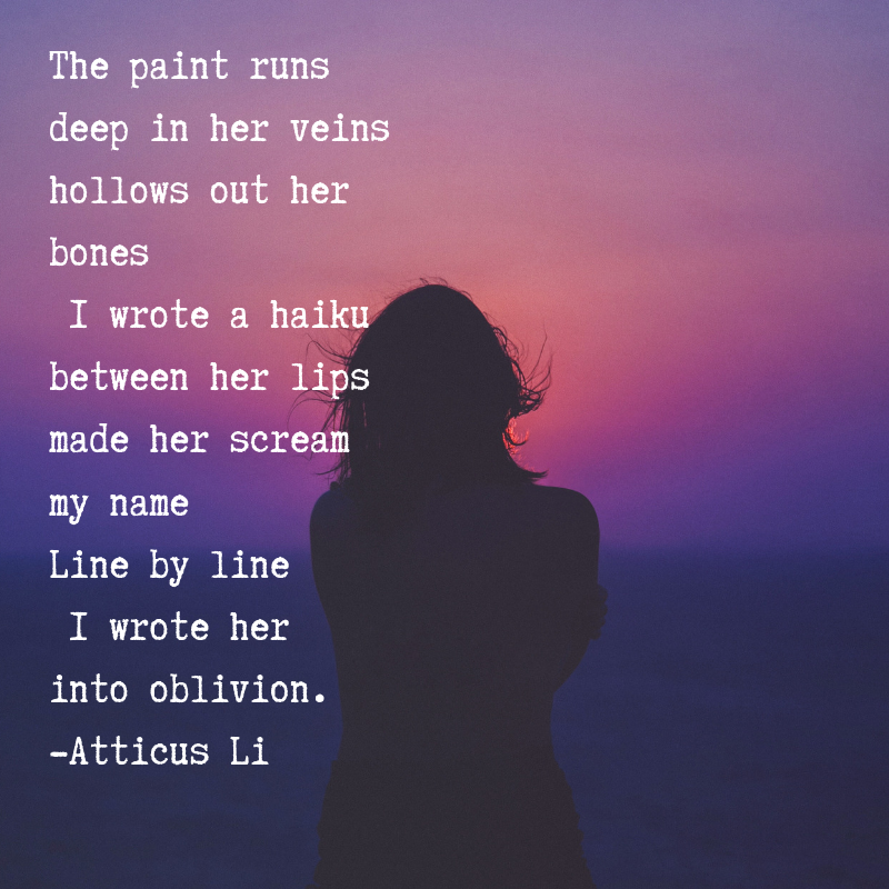 These days, Atticus Li shares his space on the world wide web with friends and fellow artists. He encourages contributions and collaboration from like-minded individuals who want to express themselves in their own unique poetry. He proposes a union of thoughts to transcend gaps and stigma amidst societal issues,