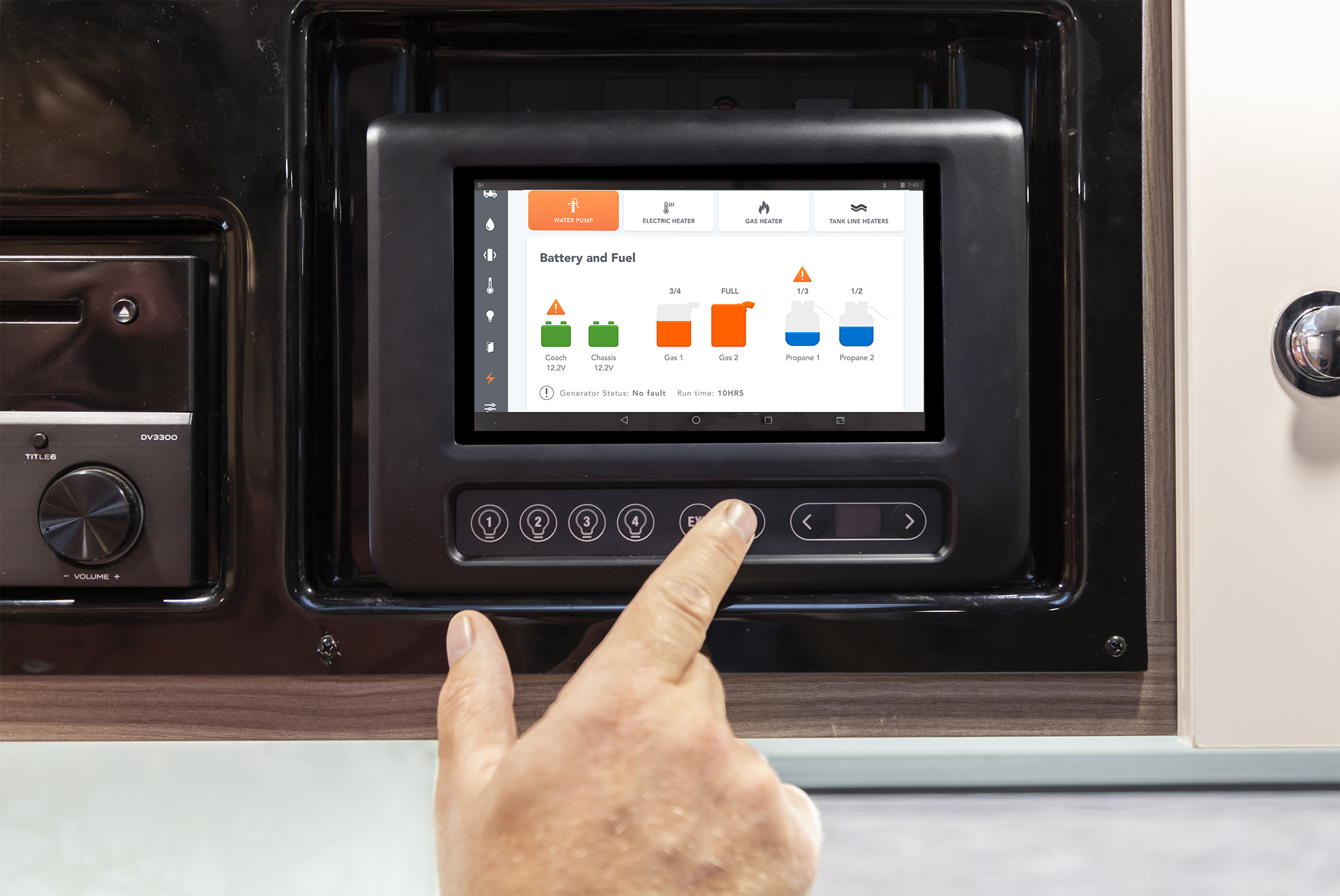 RVMaster is a RV control and monitoring system for easy management of RV features via a console or an app. The RVMaster monitors water tanks, tyre pressure, doors, windows, temperatures, propane levels and more, whilst it controls functions such as lighting, slide-outs, awnings, HVAC, generators and more. The RVMaster has a fixed console panel and also offers the flexibility of performing the same functionality by coupling with an app on the RV user’s own phone.