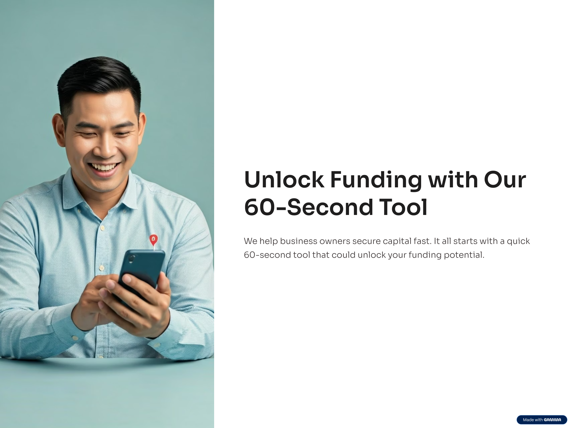 “Our job is to get business owners access to capital — and it begins with a 60-second pre-qualifying tool that could unlock your funding.”