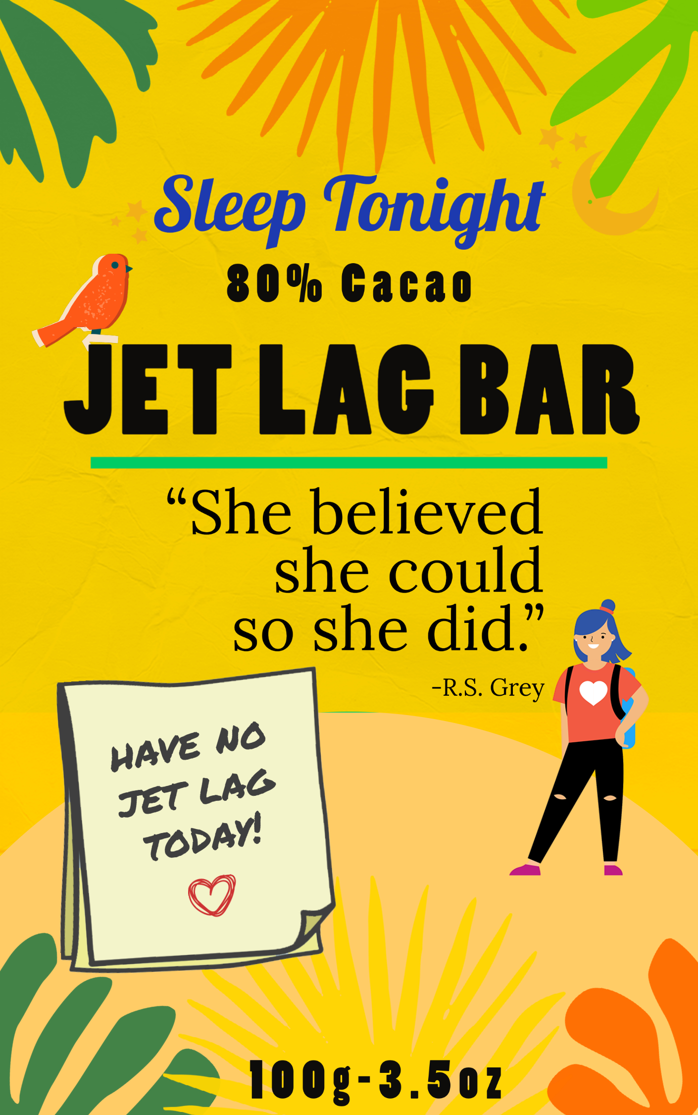 The JET LAG BAR is the world's first non-narcotic sleep-inducing chocolate, containing a shot of natural L-Theanine from Taiyo Kagaku Co., Ltd., a leading manufacturer of the amino acid L-Theanine. The JET LAG BAR is made in Israel by Bar Extra Chocolate located in the Ma'ale Chever Industrial Zone in Pnei Hever ISRAEL 9042000 and contains 80% cacao, 333 milligrams of naturally derived L-Theanine amino acids >98% pure per 100-gram bar. The JET LAG BAR is certified kosher by the New York-based ORTHODOX UNION.