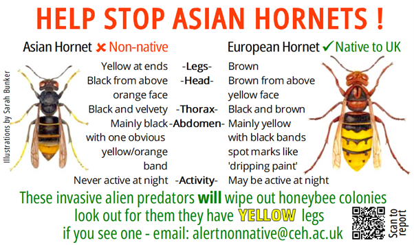 This year’s Asian Hornet Week, running from 2nd to 8th September focuses on raising awareness about the differences between the Asian hornet and our native European hornet (Vespa crabro). Correct identification is crucial, as the European hornet plays a valuable role in our ecosystem and should not be mistaken for its destructive cousin.