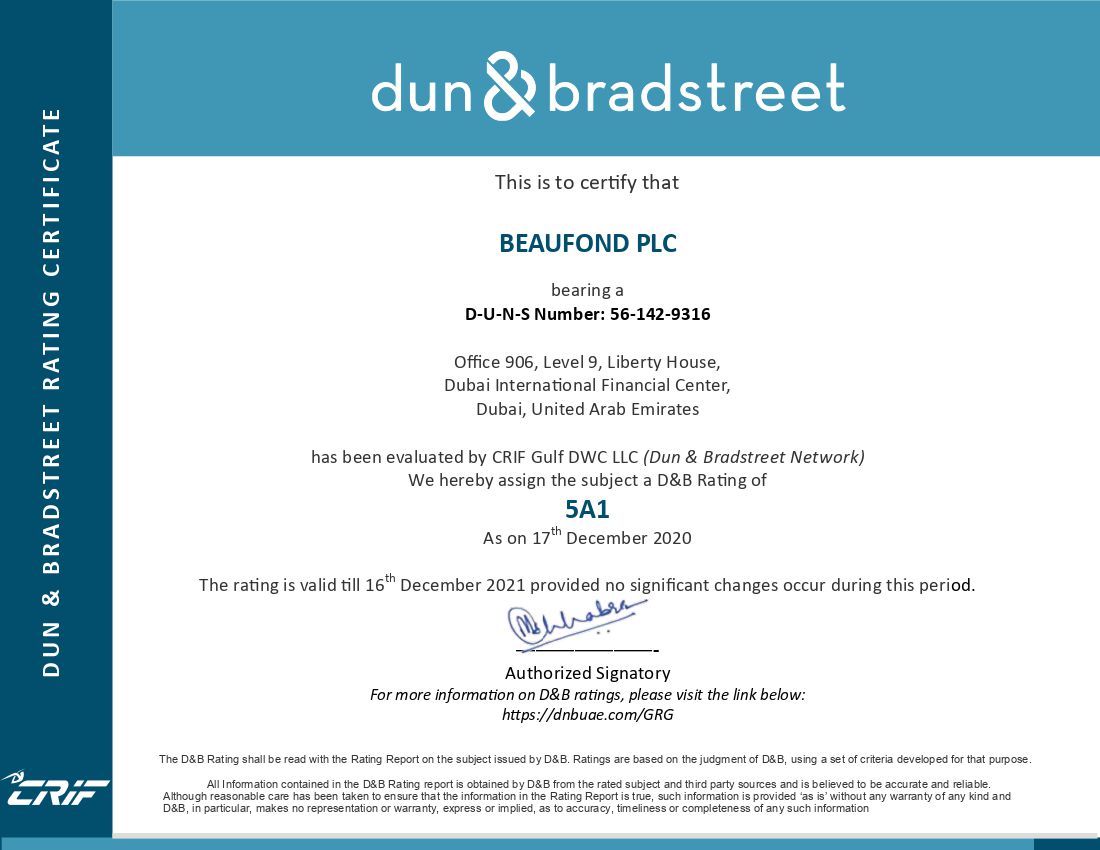 We are pleased to inform all our stakeholders that for the 3rd consecutive year, Beaufond Plc had been accredited by Dun & Bradstreet rating of 5A1, which is the highest rating given by D&B to any deserved organization.