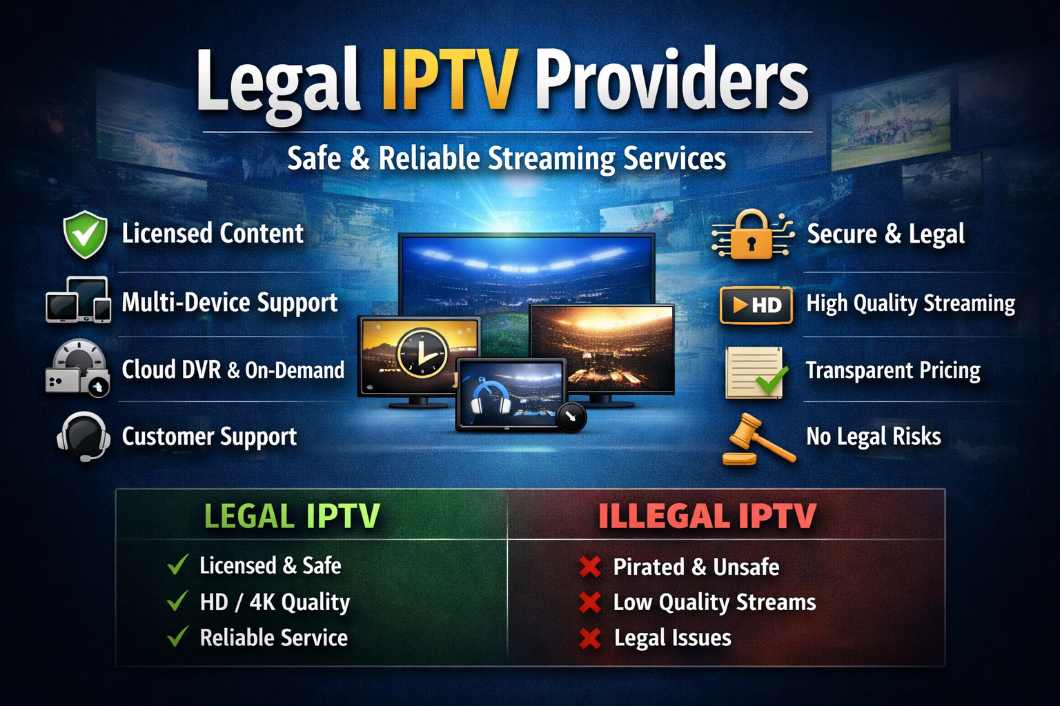 IPTV itself is legal, but legality depends on the service provider. Licensed IPTV services are completely legal, while unverified providers may stream copyrighted content without permission.
