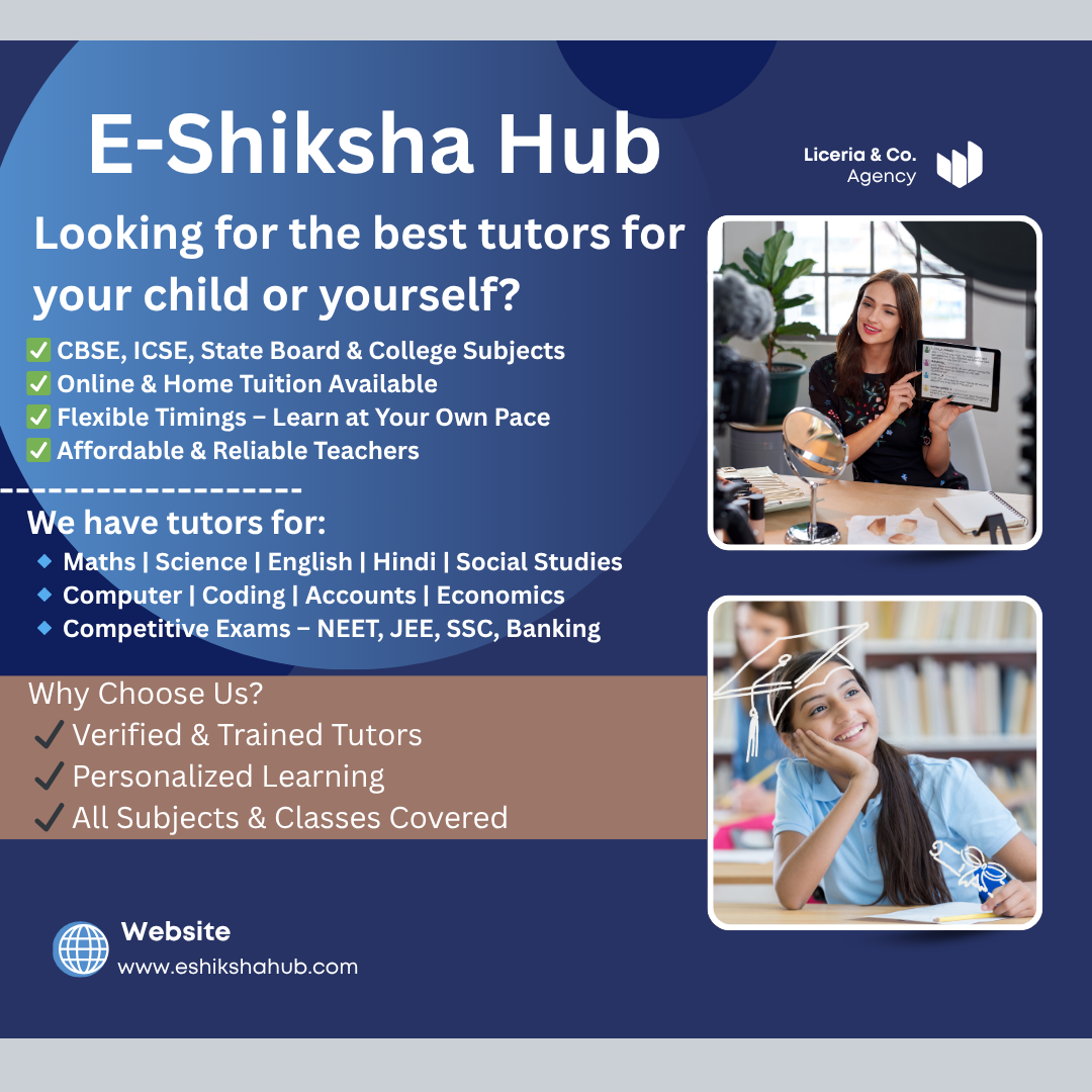 E-Shiksha Hub, a trusted name in education, is connecting students and parents across India with verified and trained online and home tutors. Whether you are preparing for board exams, competitive tests, or simply want to improve your subject knowledge, E-Shiksha Hub makes learning easy, personalized, and affordable.