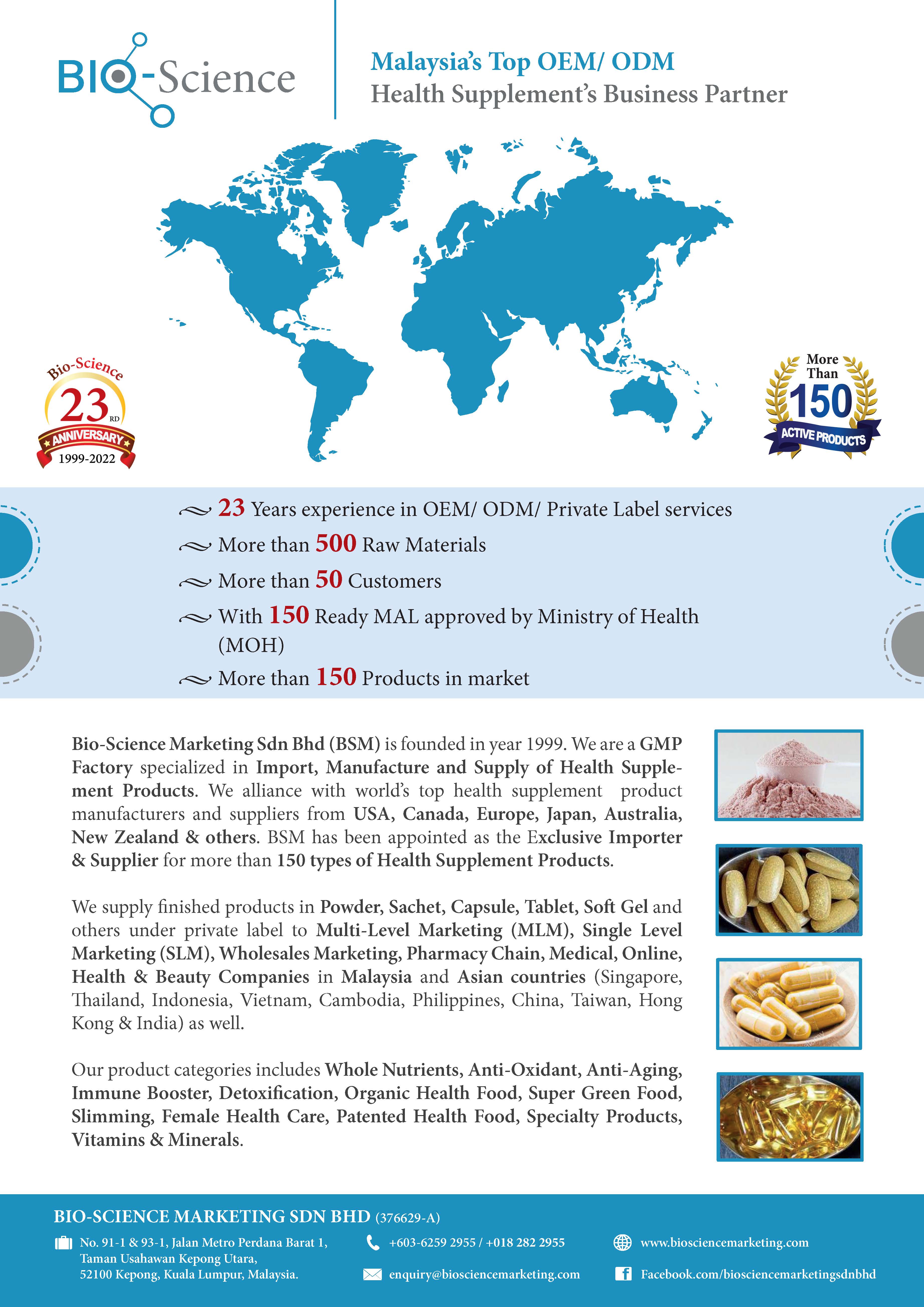 BSM, founded in 1999, with 23 years of experience and expertise in the health supplement OEM/ODM industry, has been honoured with five well-recognized awards for its outstanding performance. BSM currently consists of 45 professionals, and 80% of them are of qualified nutrition-related background. The company has 500 types of raw materials from all over the world and 100 of them are branded or patented ingredients with proven clinical studies. BSM has a total of 150 MAL products registered with the Ministry of Health Malaysia and 100 unique and innovative formulae ready to be launched. The company is currently collaborating with more than 50 clients on developing and supplying more than 150 active products in the market and expects to launch at least 30 new health supplement products annually.