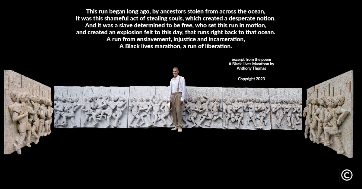 Given Governor Ron DeSantis of Florida's endeavor to downplay the brutality of Black Slavery, artist Anthony Thomas has developed a narrated art exhibition known as Black Lives Marathon to remember the African American quest for justice, freedom, and equivalent rights. Sculpted artwork composed of multiple panels of energetic runners symbolizing the black movement, paired with a six-page poem, composed in a progressive narrative, recounts the fight for black equality, beginning from slavery in America to the current time. And proposes a course of action which the artist has faith will result in continued improvement for the present generation, to whom the torch of justice has been handed