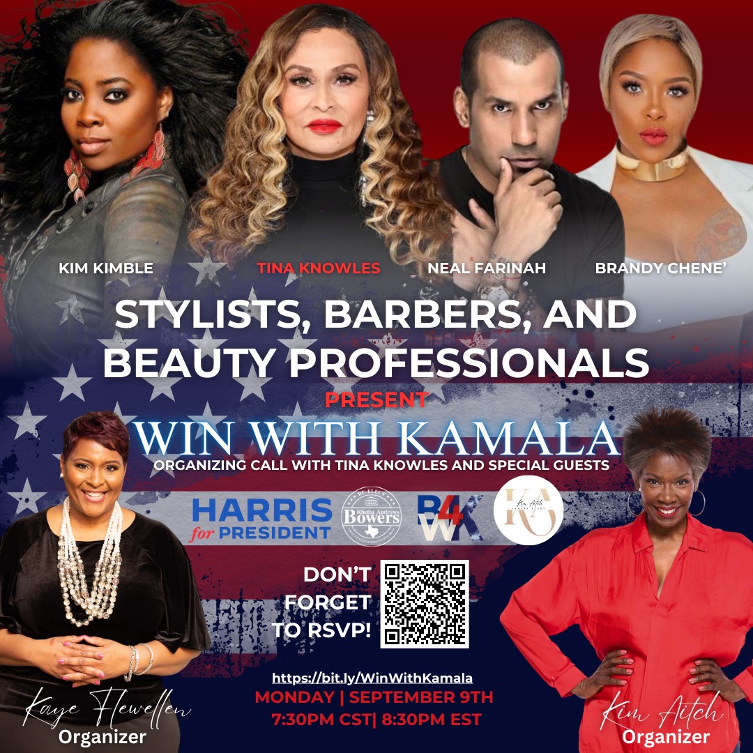 The Win With Kamala event will feature celebrity stylists and philanthropists, Tina Knowles, Kim Aitch, Kimberly Kimble & Neal Farinah, along with other special guests. Building on the energy of Vice President Harris’ official acceptance of the nomination to become the Democratic nominee, the group plans to share tools and resources needed to help expand voter registration and participation efforts as Americans head to the polls on November 5th.