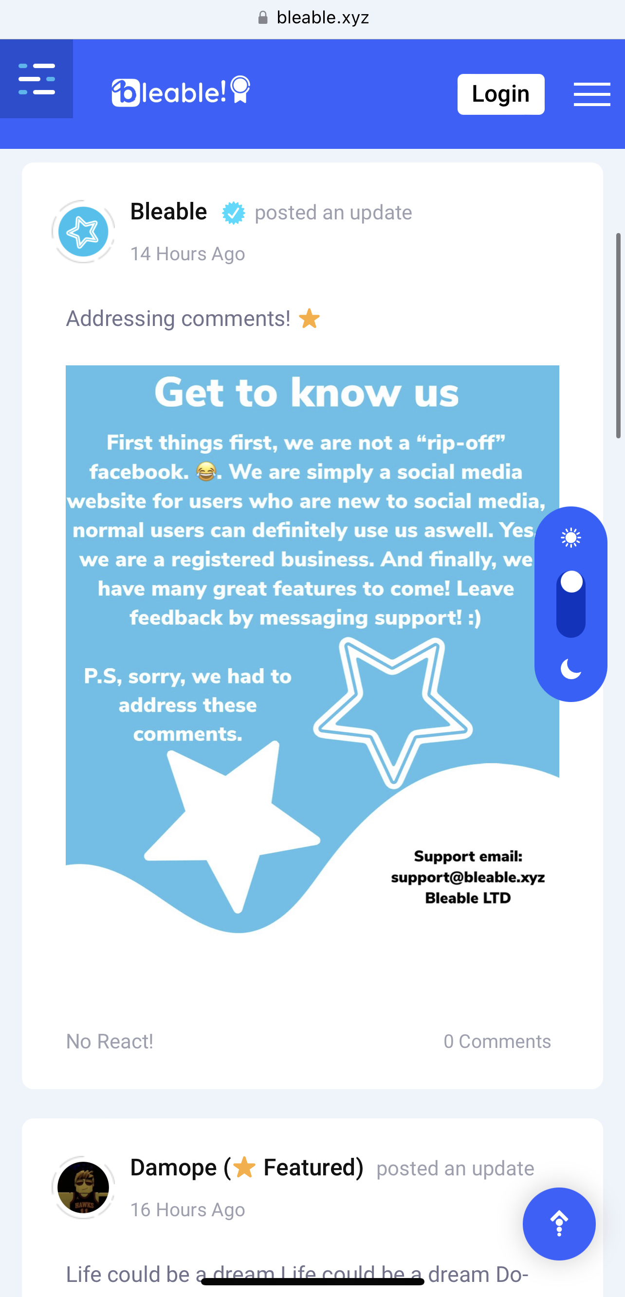 Los Angeles, California Jun 5, 2022 (Issuewire.com) - Bleable is the ultimate social media website for people who are new to social media. Users who already have experience with social media can also use us as well. Our website link for Bleable is https://bleable.xyz. For support, you can email support@bleable.xyz, or you can contact support directly from our website. For help and tutorials, visit the help center. Users have full control of their profile customization. To sign up, users have to provide their username, email, and password. Bleable also holds legal data from users, if users would like their private data to be exported and deleted, they can send us a request in settings.