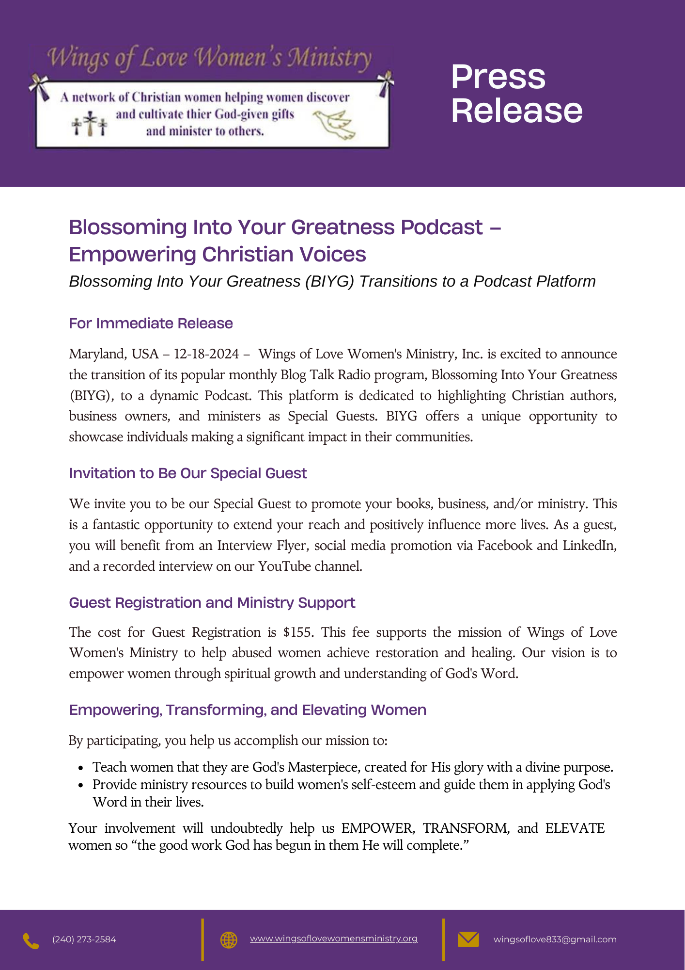 Baltimore, Maryland Dec 18, 2024 (Issuewire.com) - Wings of Love Women's Ministry, Inc. is excited to announce the transition of its popular monthly Blog Talk Radio program, Blossoming Into Your Greatness (BIYG), to a dynamic Podcast. This platform is dedicated to highlighting Christian authors, business owners, and ministers as Special Guests. BIYG offers a unique opportunity to showcase individuals making a significant impact in their communities.