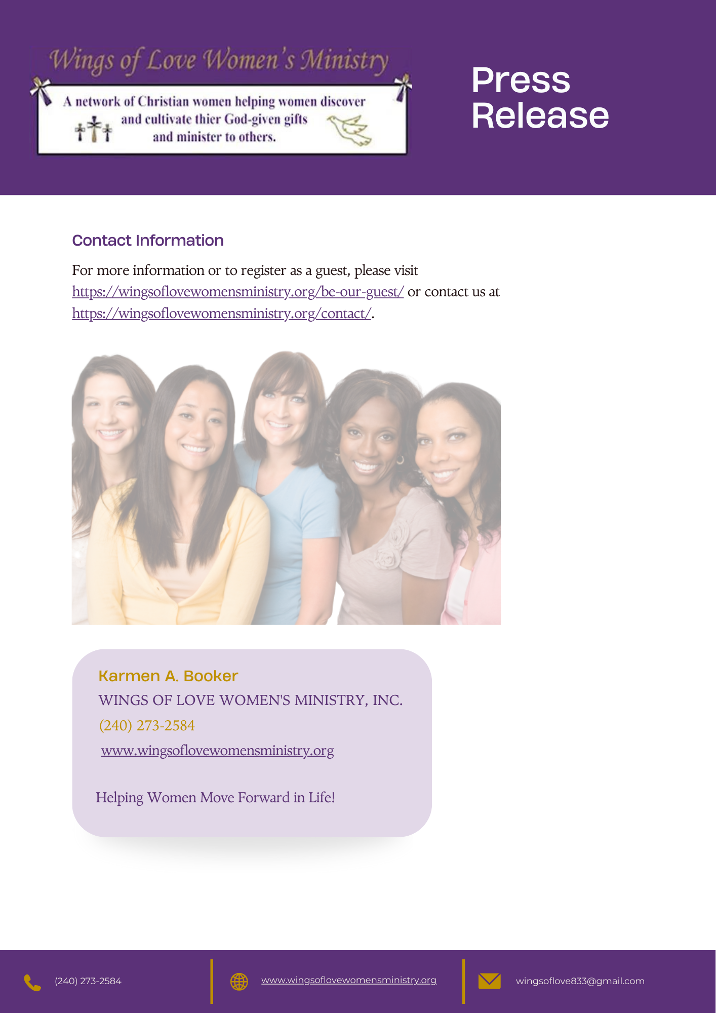 For more information or to register as a guest, please visit https://wingsoflovewomensministry.org/be-our-guest/ or contact us at https://wingsoflovewomensministry.org/contact/.