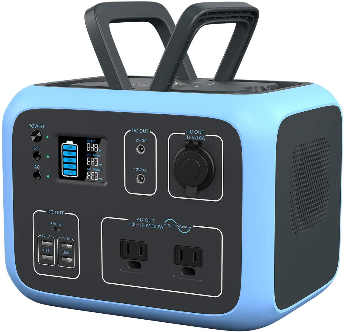 - 500Wh Portable Power Station: G-mark Award 2019 power station, high capacity 500Wh/300W(Peak 450W) rechargeable lithium solar generator, 500Wh (45Ah, 11.1V) with 2 120V AC-Outlet(Pure Sine-wave) can charge small appliances (Max.300W) such as smartphones 36 times, laptops(45W) 9 times, Gopro 80 times, Drone, mini projector, mini car fridge, and other appliances, portable vital emergency power backup battery for RV Outdoors, camping or hurricane, and other power outage situations