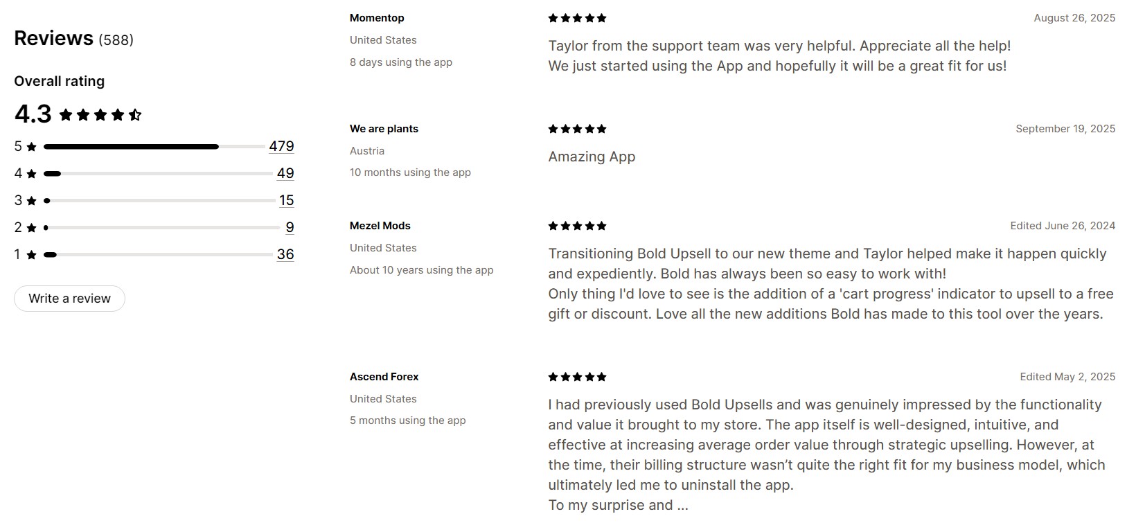 The price shift also reflects broader patterns within Shopify's app ecosystem, where tiered, feature-based subscription models have become a standard expectation of merchants. Bold's adoption of this familiar structure makes pricing comparison more straightforward while reducing the unpredictability Shopify’s store owners were experiencing under Upsell’s usage-only billing.
