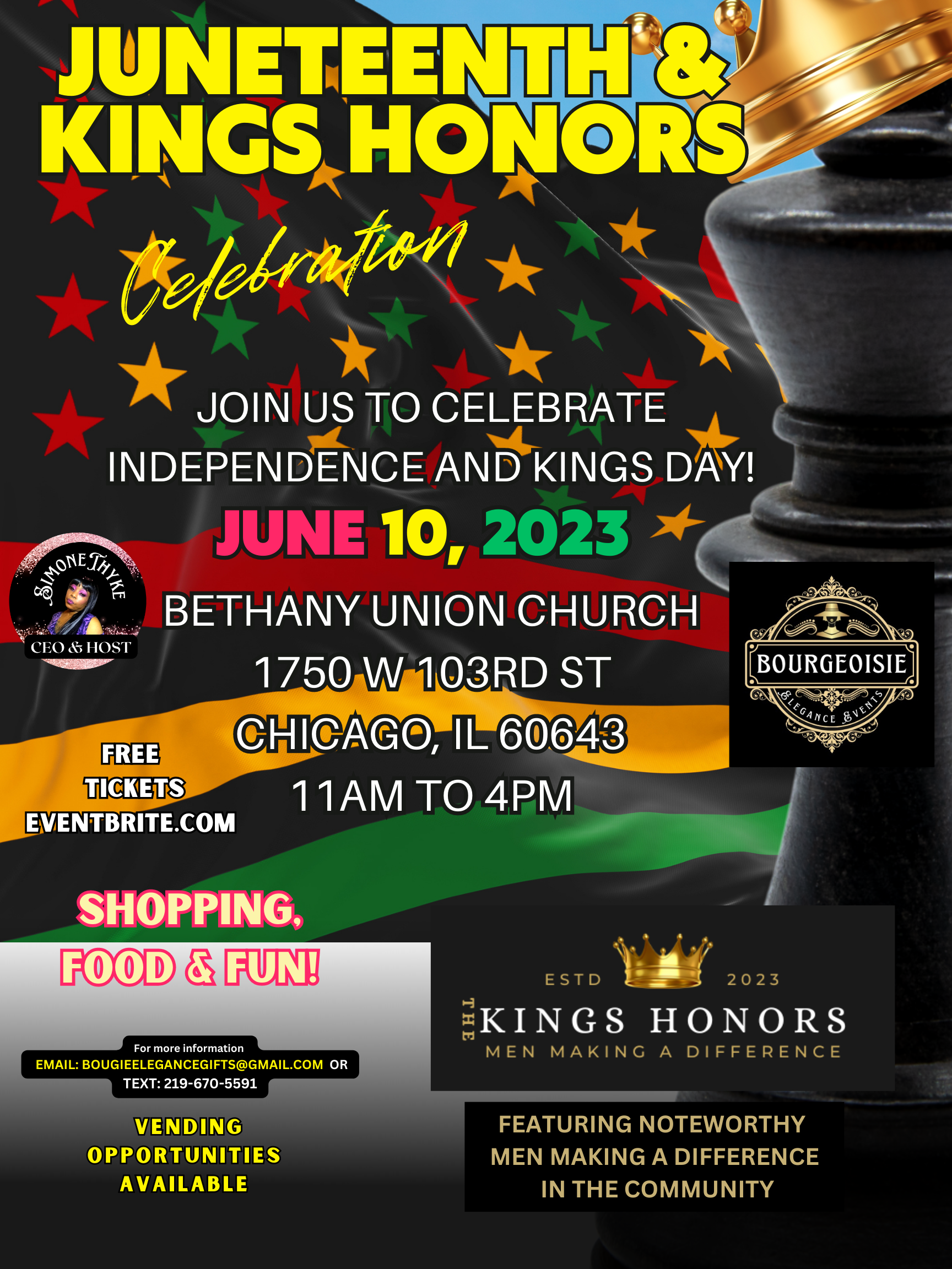 Bourgeoisie Elegance Events and Jewelz of Elegance Magazine are excited to announce the Juneteenth/Kings Honors Celebration, a one-of-a-kind event that honors six men and kings who have made outstanding achievements in their industries and the community. The event will be held on June 10, 2023, from 11 am to 4:30 pm at Bethany Union Church in South Beverly.