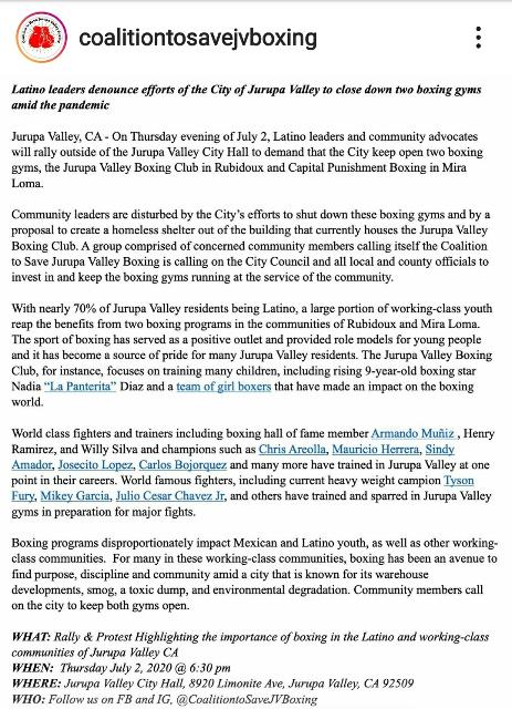 The Jurupa Valley Boxing Club and Capital Punishment Boxing Club seeks the public's financial help and moral support. A rally is planned for today, July 2, 2020, at 6 pm by the newly formed "Coalition to Save the Jurupa Valley Boxing Club". The affected boxing clubs request the community's support and the media's attention and presence.